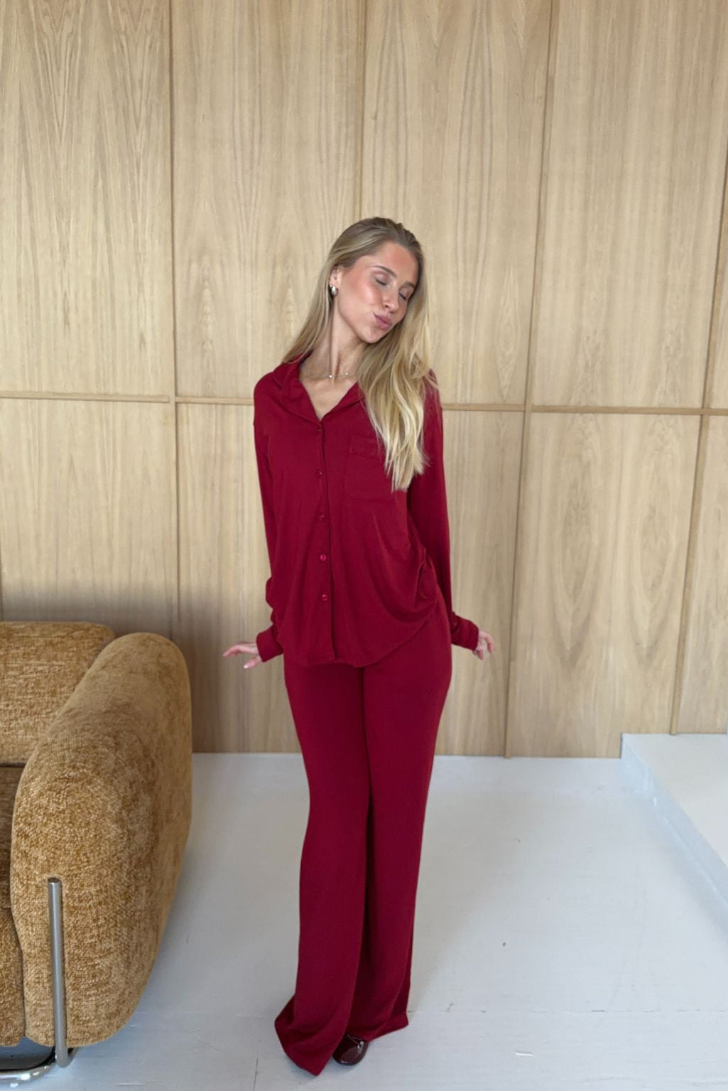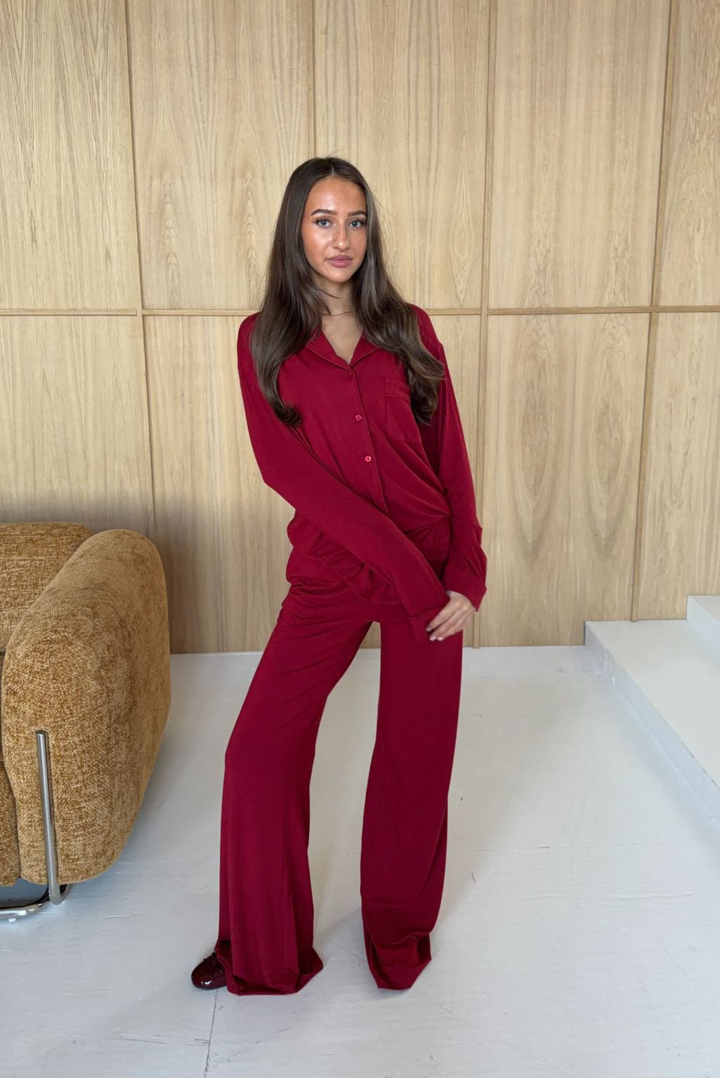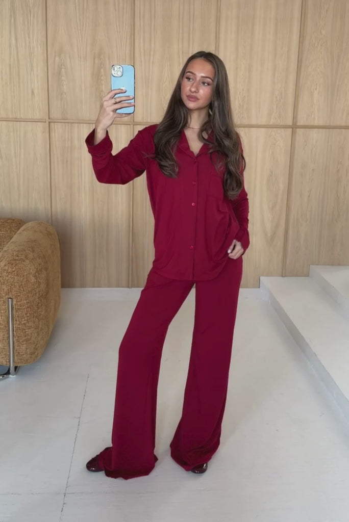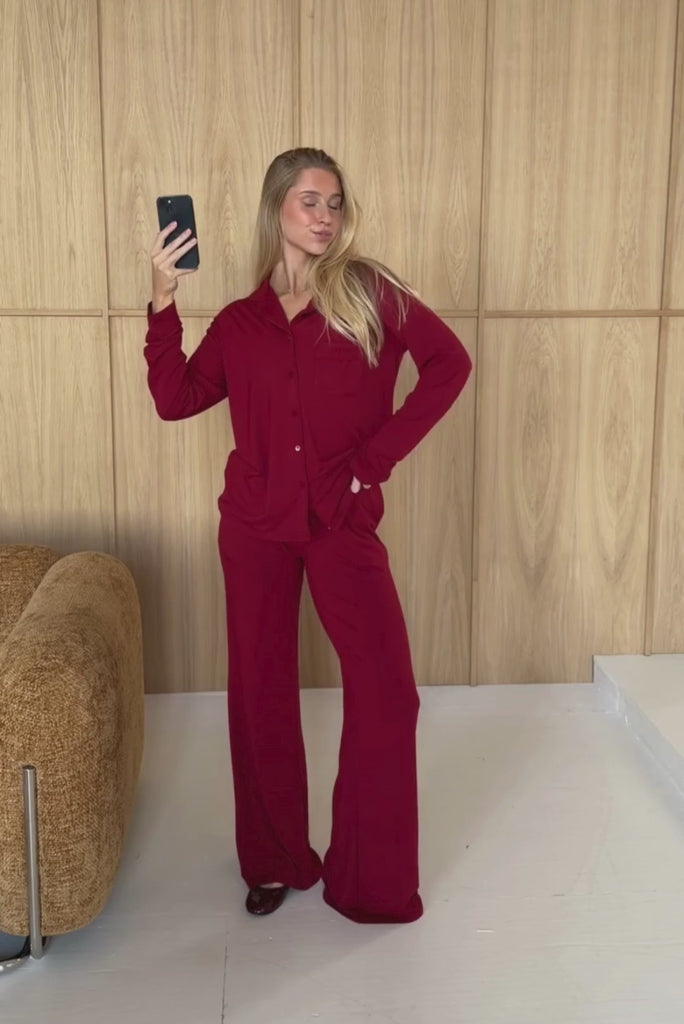 FITBERRY® HOLIDAY PYJAMAS PANTS. The softest pyjamas pants in a rich burgundy shade featuring a wide flared leg, hidden elastic drawstring waist and deep pockets. Crafted from a silky, breathable modal rib with an oversized fit and gentle stretch. This set is perfect for slow winter mornings and late nights at home.
