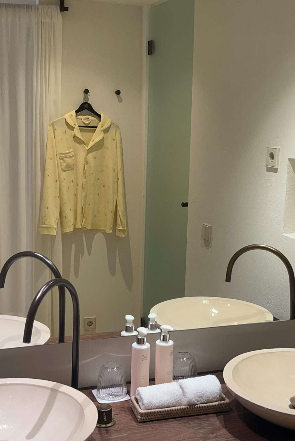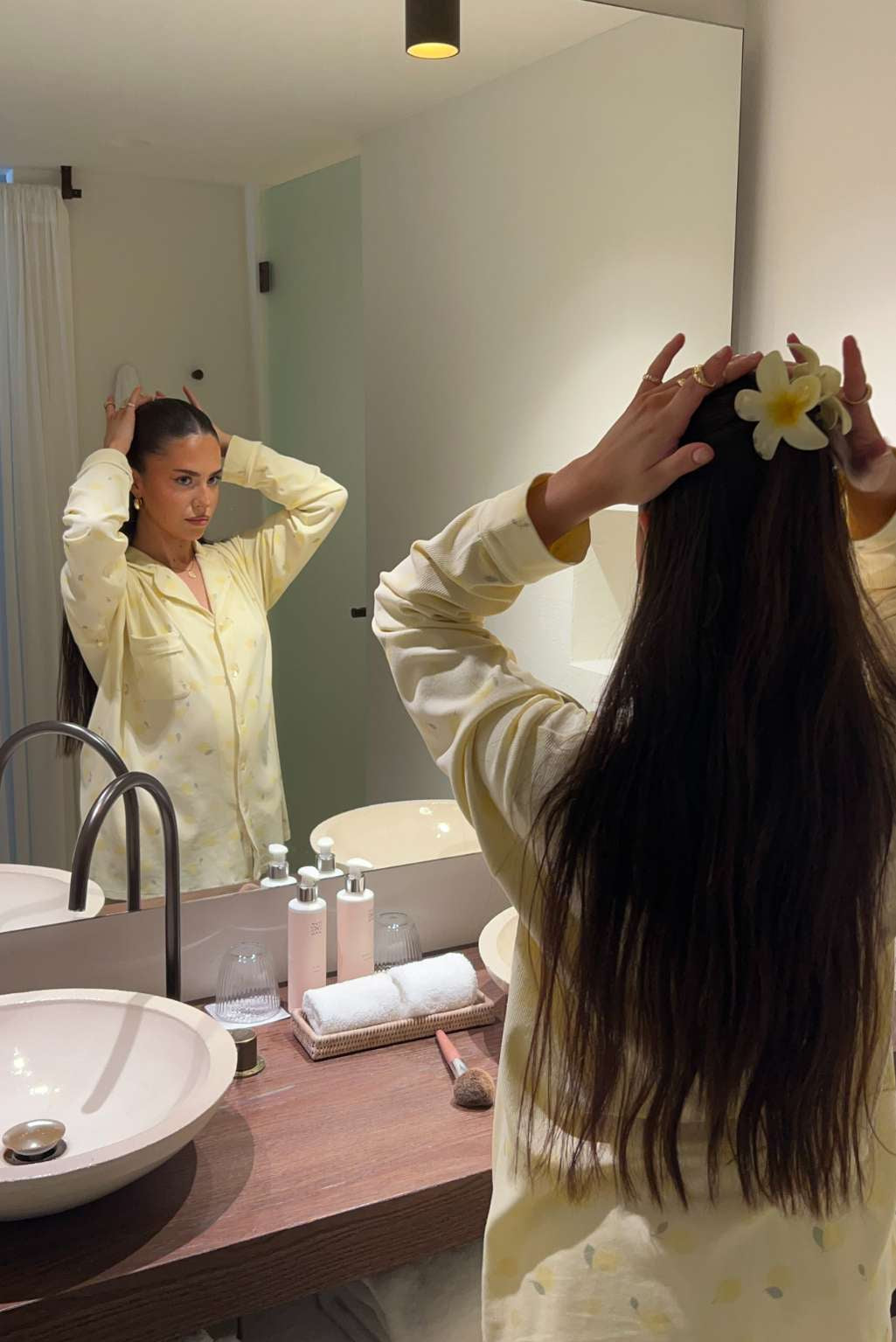 Model 1: Anne is 160cm and wears a size S/M in pyjamas shirt and pants for an extra oversized fit.