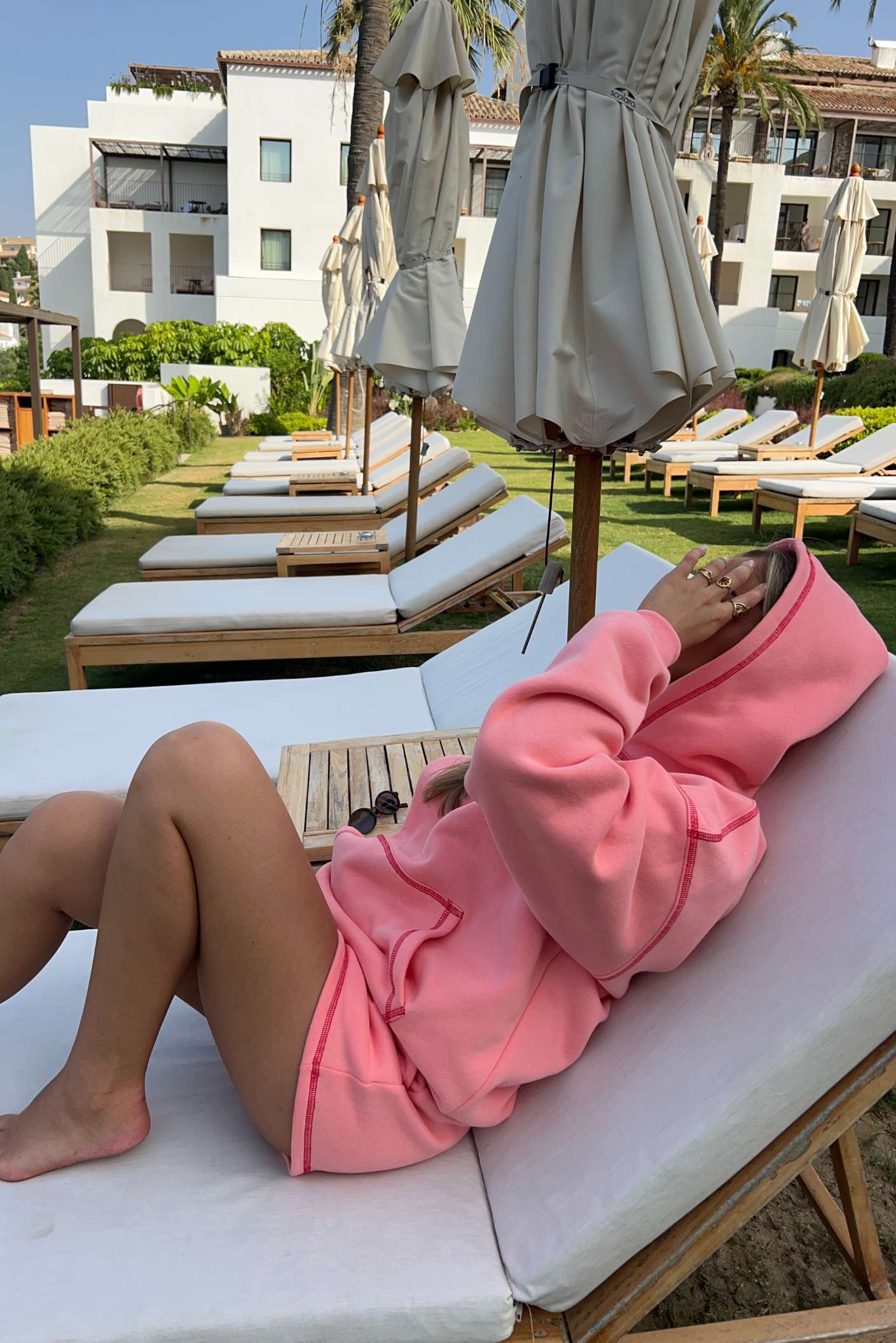 Model 2: Hanna is 160cm and wears a size S in hoodie and size XS in joggers / shorts.