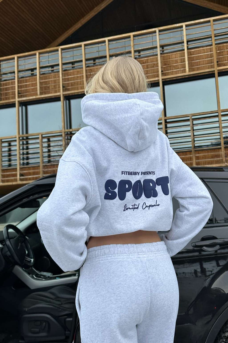 FITBERRY® SPORT OVERSIZED HOODIE. An oversized hoodie crafted from premium high-quality cotton fabric. The hoodie has a soft fleece interior, dropped shoulders, a cozy hood and ribbed details on the sleeves and waist. Featuring FITBERRY® SPORT print to front and back.