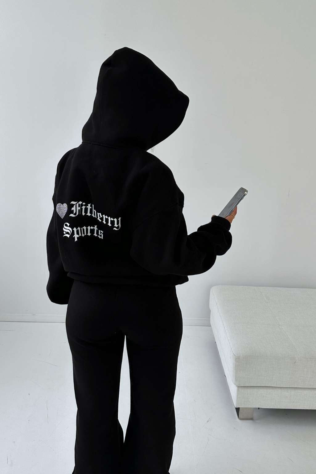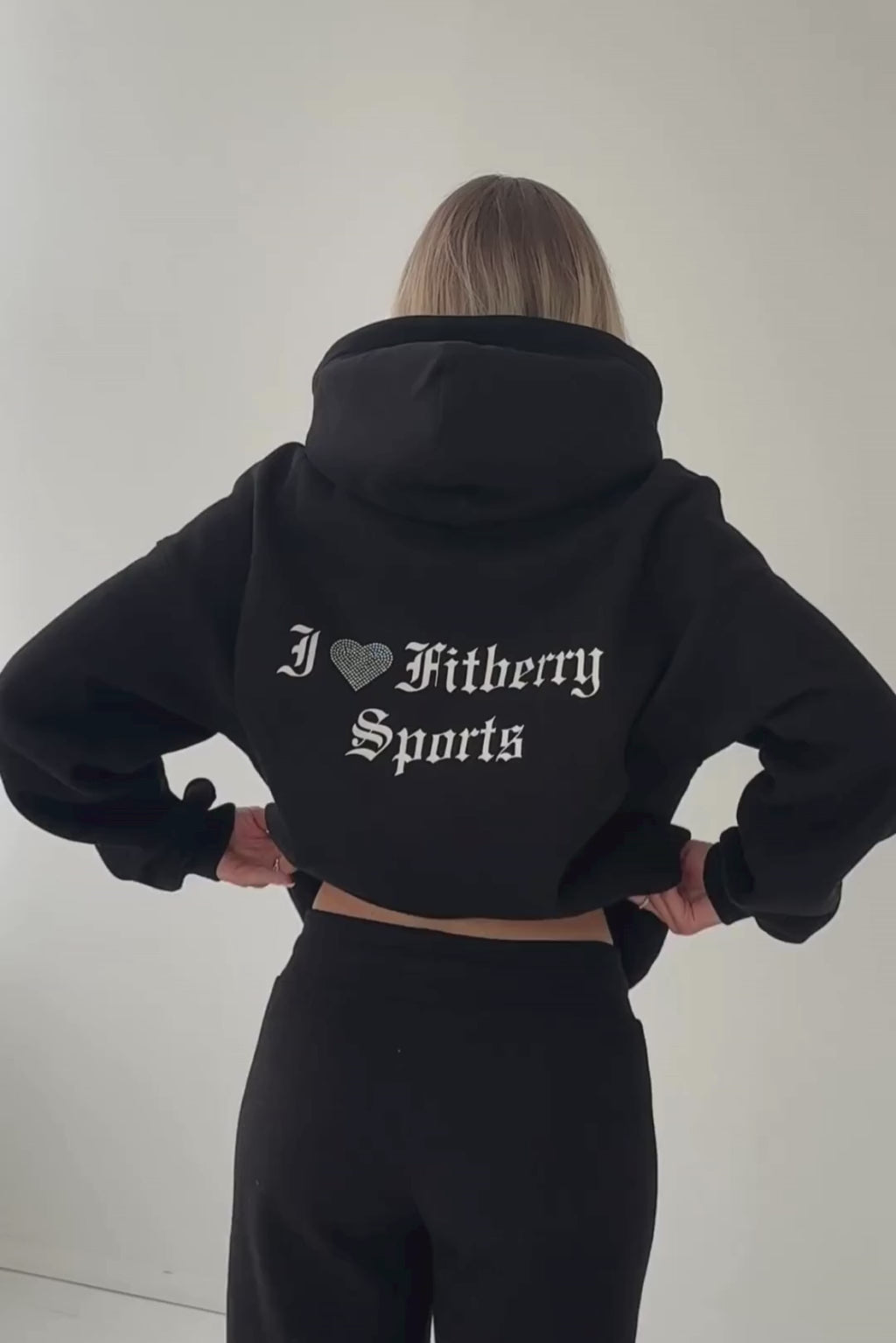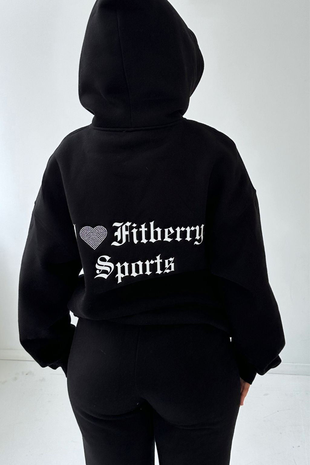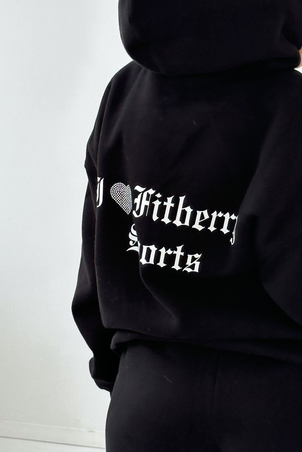 I ♥ FITBERRY® OVERSIZED ZIP HOODIE. An oversized hoodie crafted from premium high-quality cotton fabric. The hoodie has a zipper in front, soft fleece interior, dropped shoulders, side pockets, a cozy hood and ribbed details on the sleeves and waist. Featuring I ♥ FITBERRY print to front and back with handmade rhinestone heart.