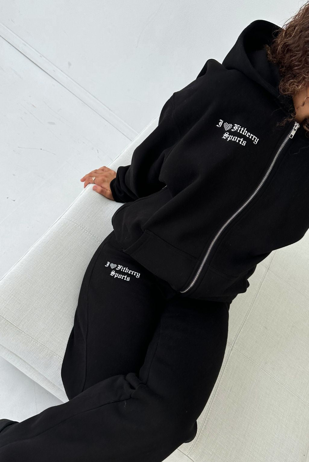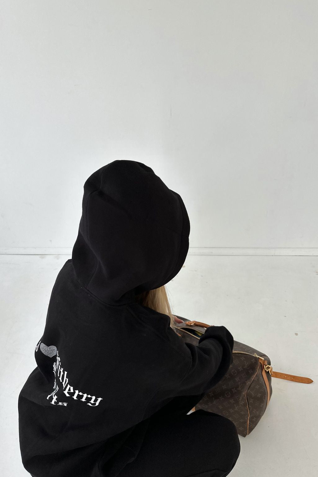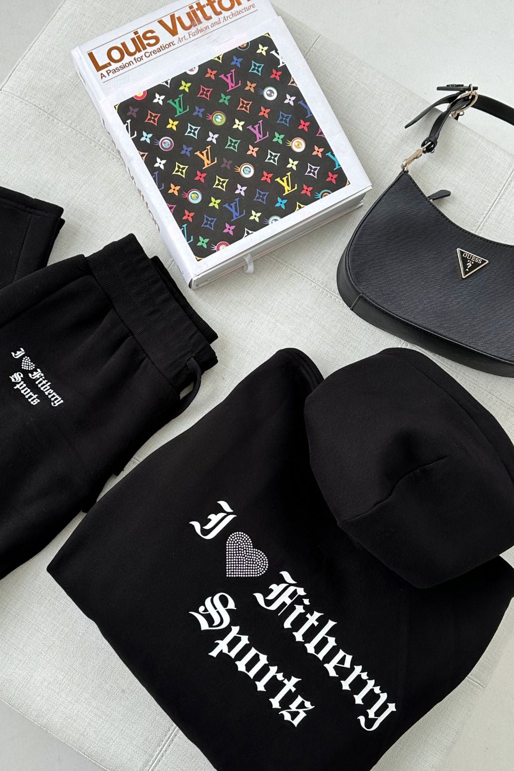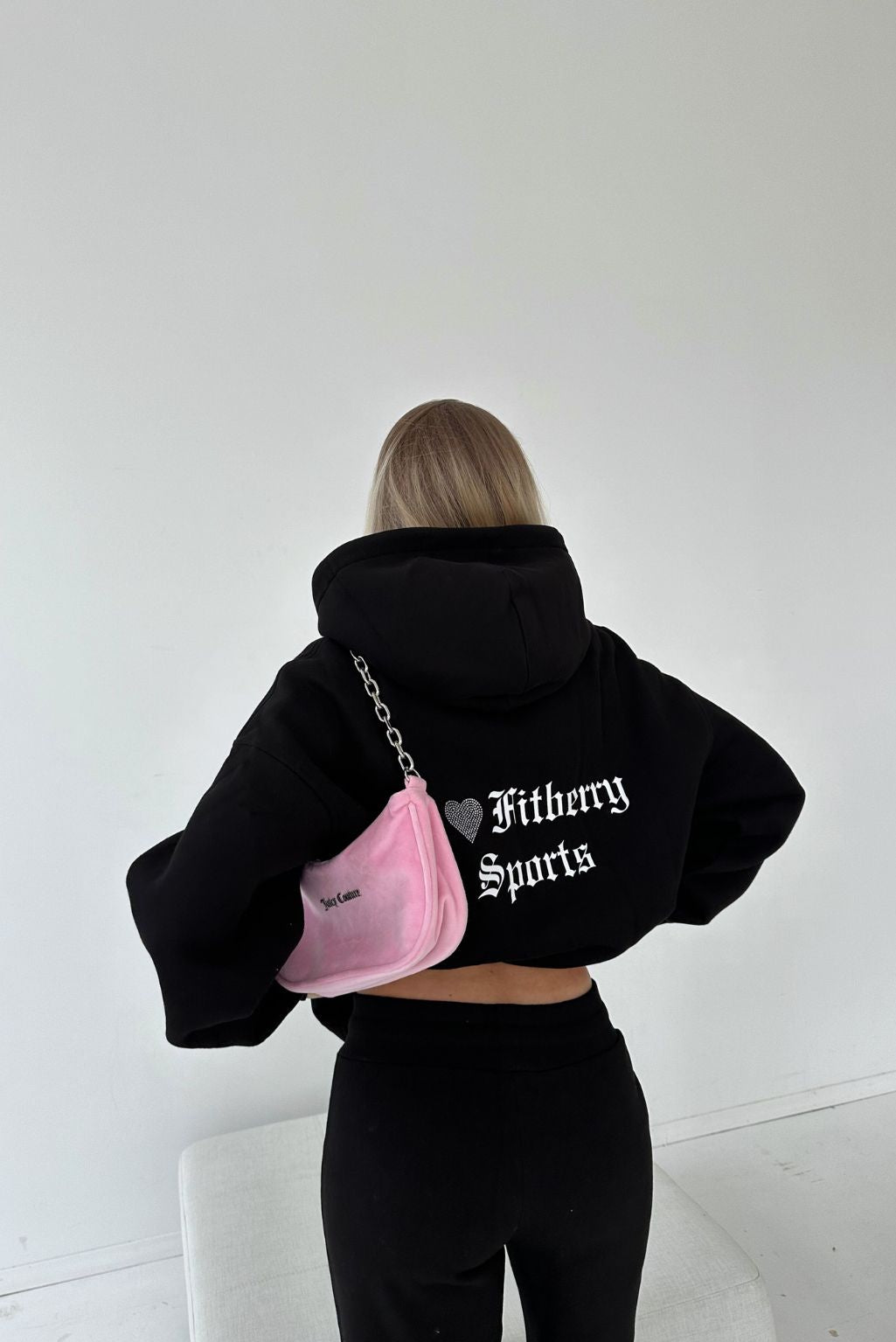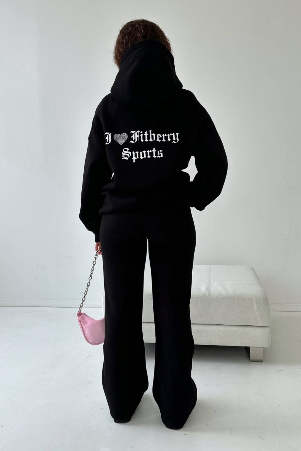I ♥ FITBERRY® OVERSIZED ZIP HOODIE. An oversized hoodie crafted from premium high-quality cotton fabric. The hoodie has a zipper in front, soft fleece interior, dropped shoulders, side pockets, a cozy hood and ribbed details on the sleeves and waist. Featuring I ♥ FITBERRY print to front and back with handmade rhinestone heart.