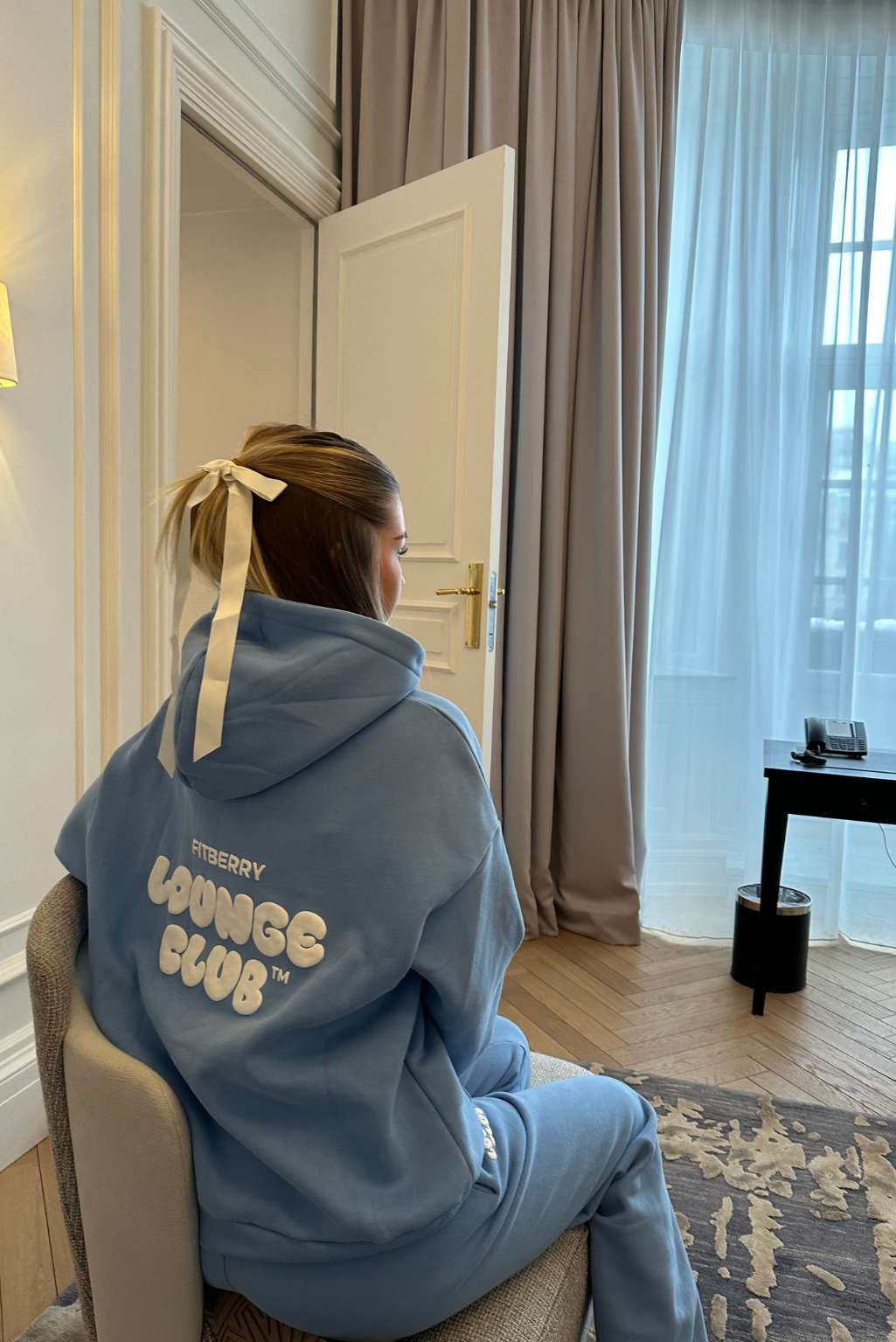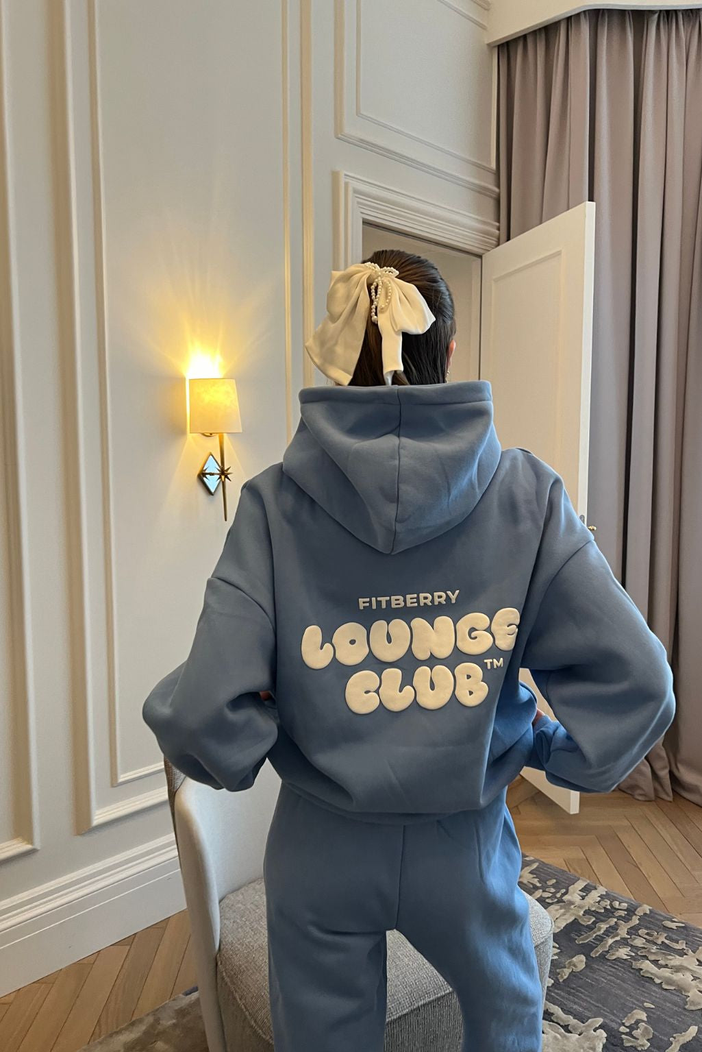 FITBERRY® LOUNGE CLUB OVERSIZED HOODIE. An oversized hoodie crafted from a premium high-quality cotton fabric. The hoodie has a soft fleece interior, dropped shoulders, a cozy hood and ribbed details on the sleeves and waist. Featuring our signature Fitberry Lounge Club print to front and back.