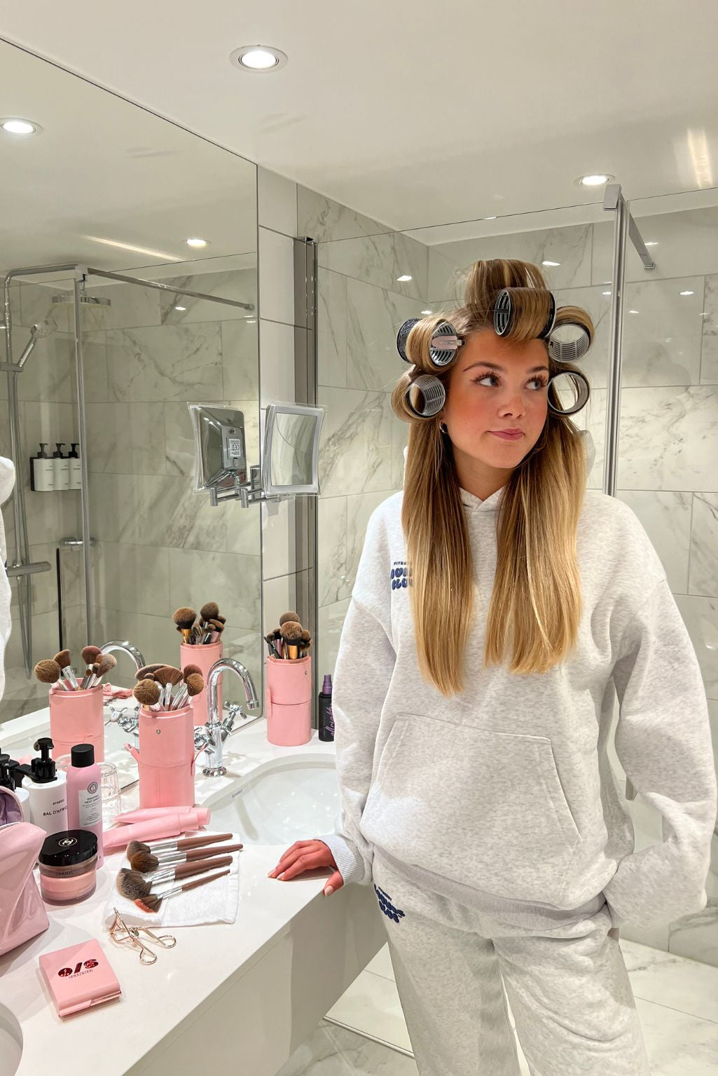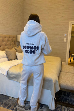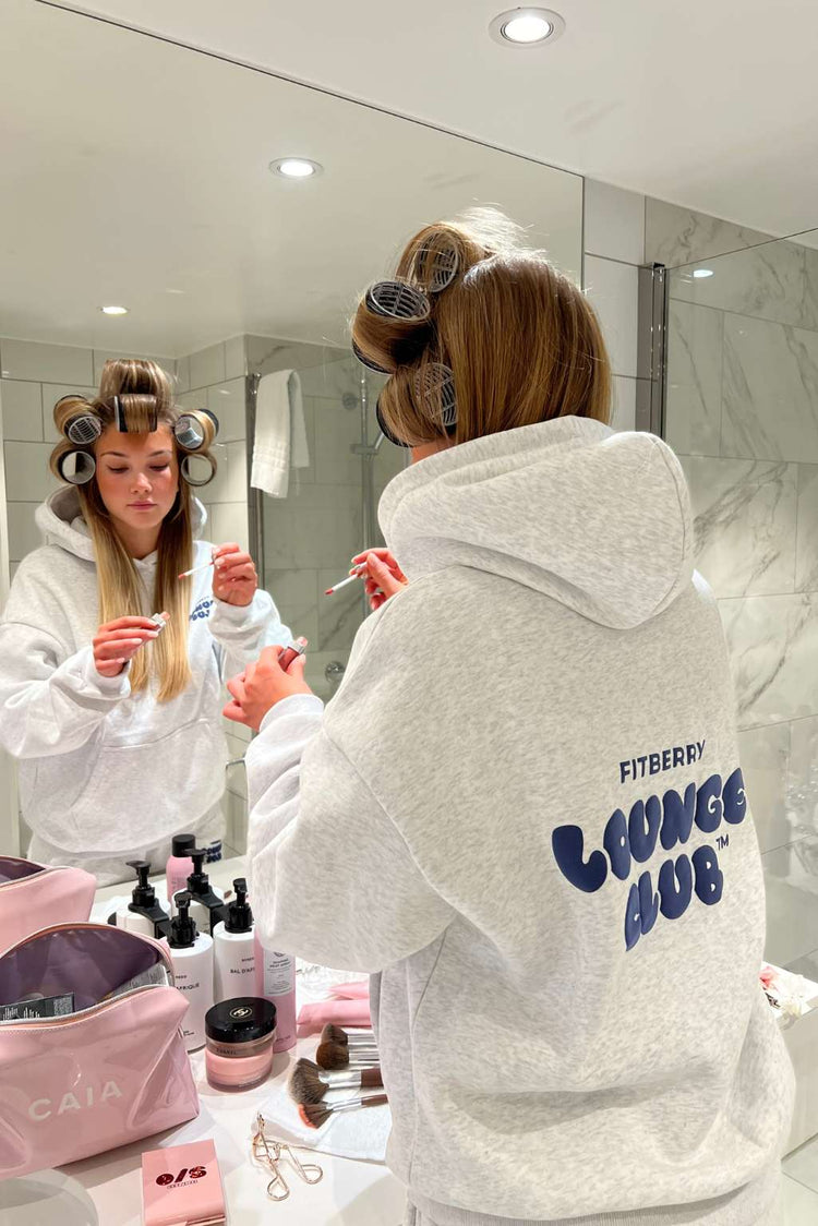 FITBERRY® LOUNGE CLUB OVERSIZED HOODIE. An oversized hoodie crafted from a premium high-quality cotton fabric. The hoodie has a soft fleece interior, dropped shoulders, a cozy hood and ribbed details on the sleeves and waist. Featuring our signature Fitberry Lounge Club print to front and back.