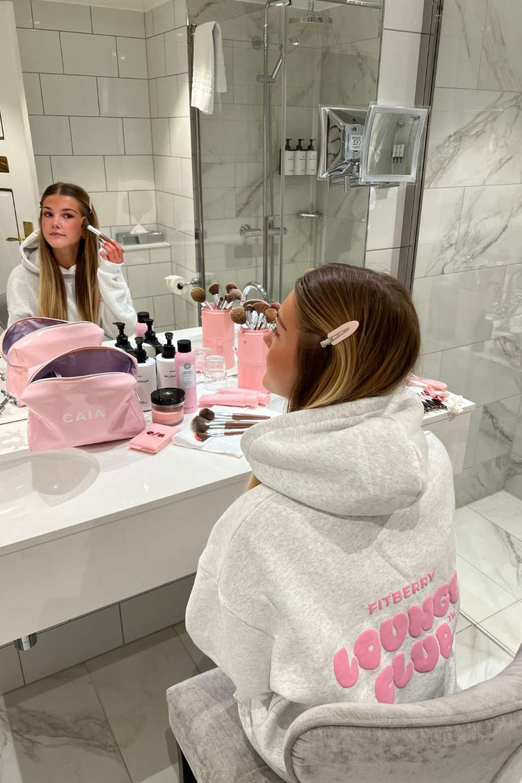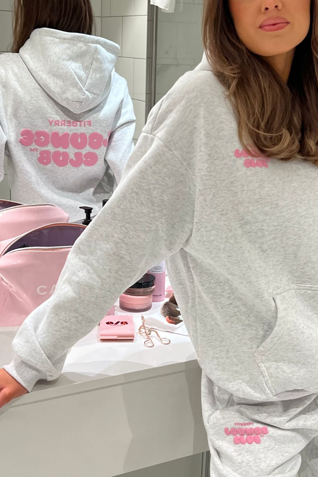 FITBERRY® LOUNGE CLUB OVERSIZED HOODIE. An oversized hoodie crafted from a premium high-quality cotton fabric. The hoodie has a soft fleece interior, dropped shoulders, a cozy hood and ribbed details on the sleeves and waist. Featuring our signature Fitberry Lounge Club print to front and back.