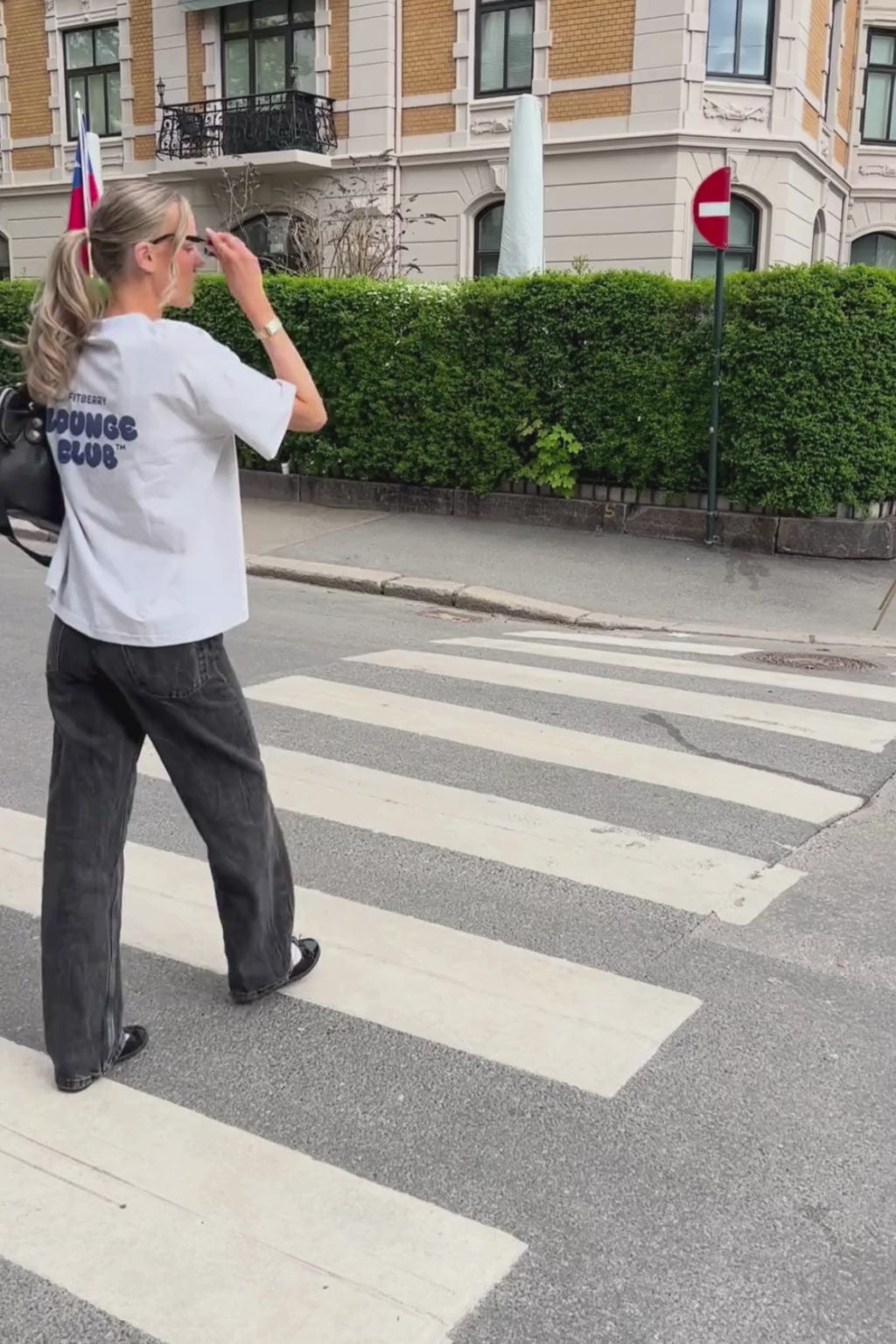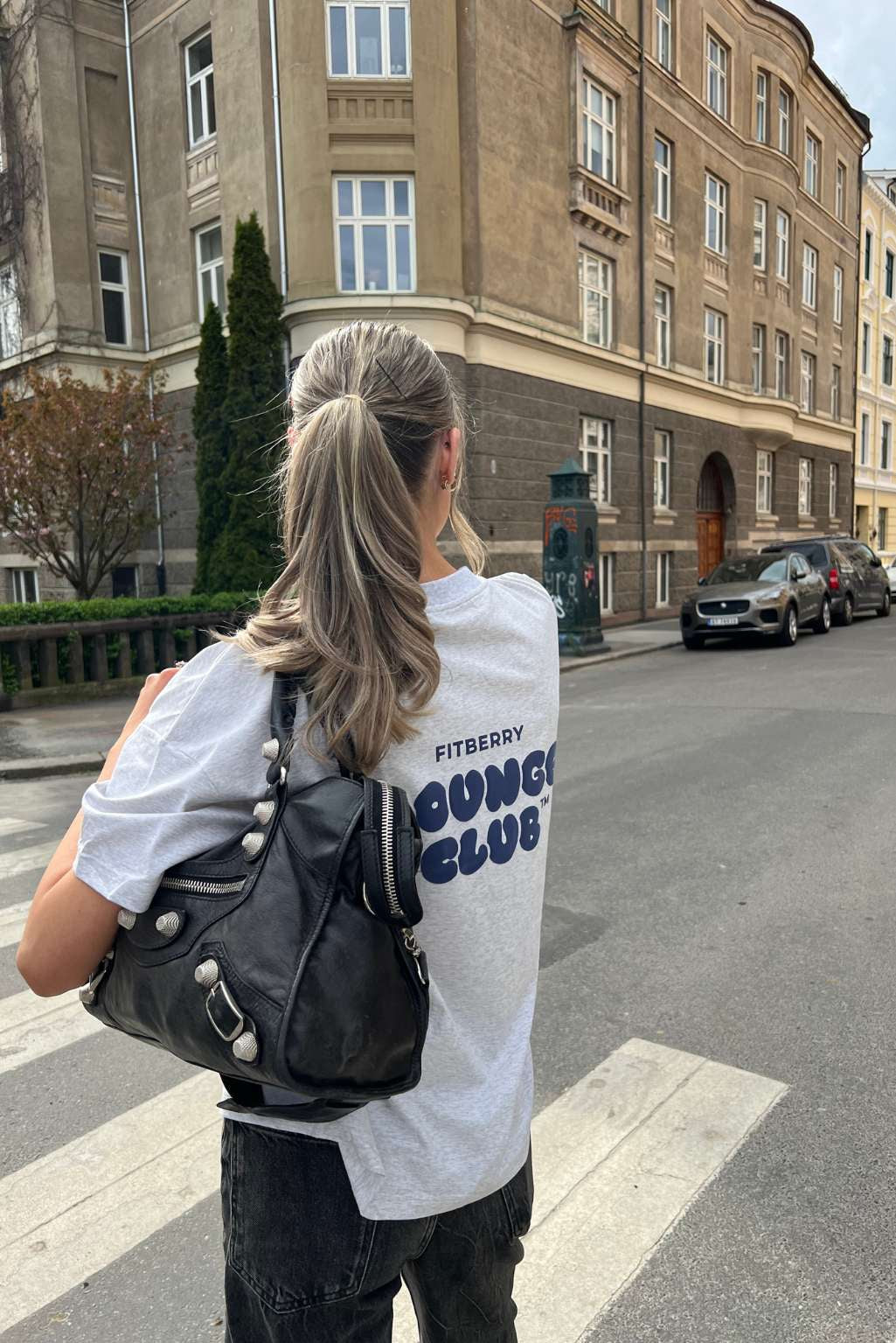 FITBERRY® LOUNGE CLUB OVERSIZED TEE. A t-shirt with an oversized fit. Crafted from a premium high-quality cotton fabric with a soft handfeel. The tee has a round neckline, dropped shoulders, loose sleeves and Fitberry Lounge Club print to front and back.