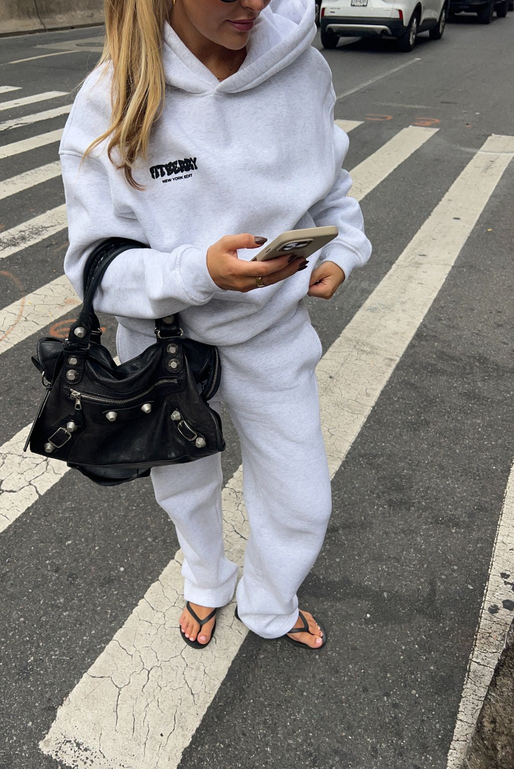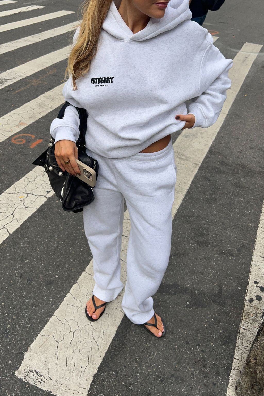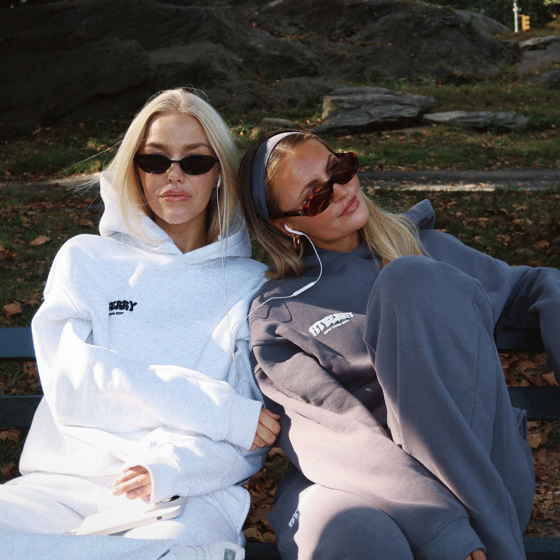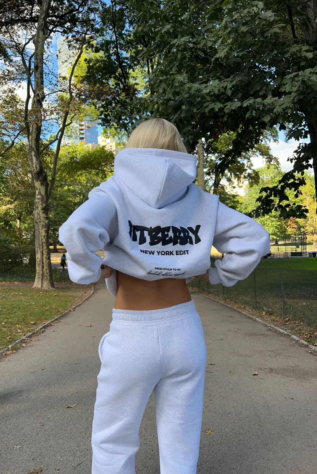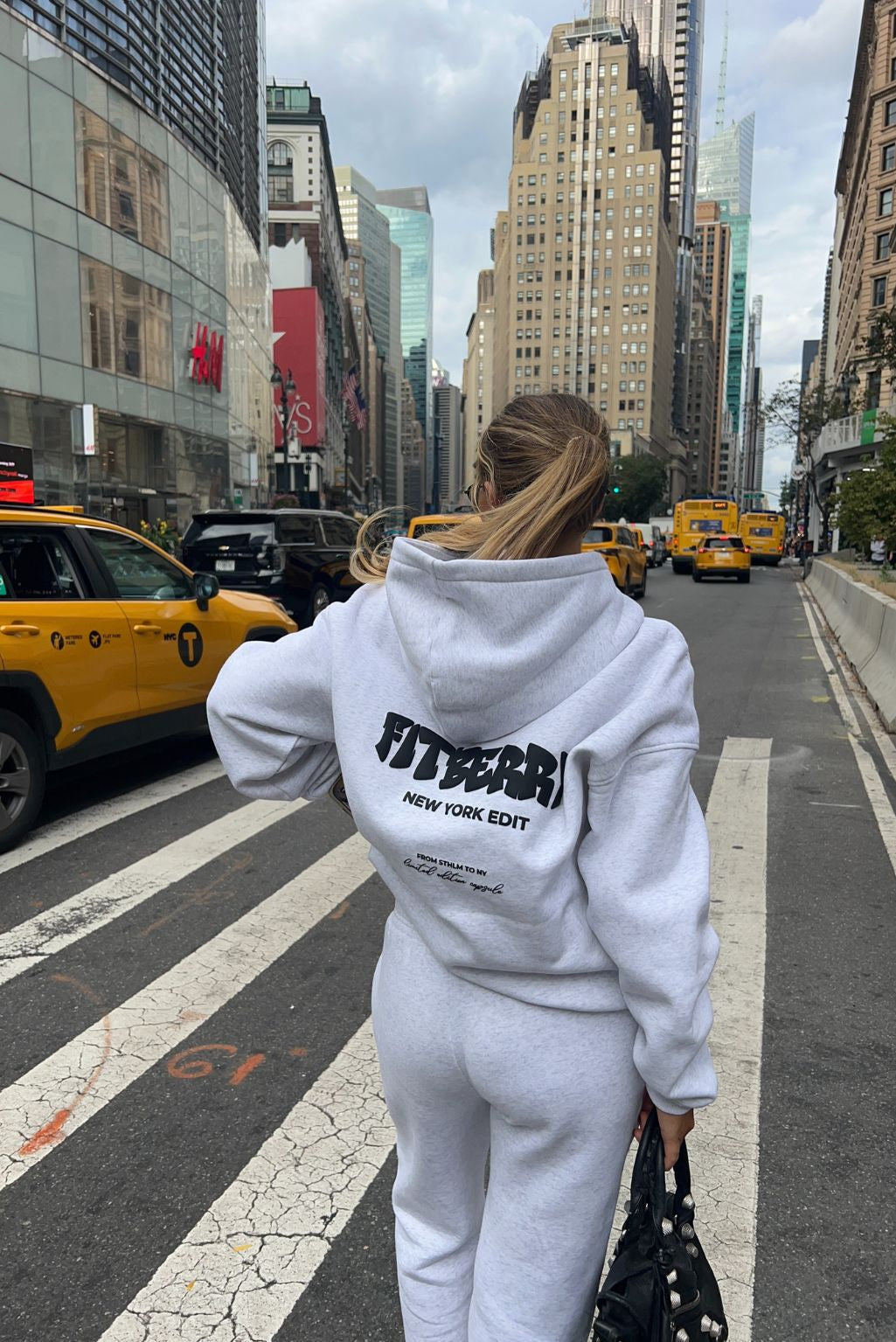 FITBERRY® NEW YORK EDIT OVERSIZED HOODIE. An oversized hoodie crafted from premium high-quality cotton fabric. The hoodie has a soft fleece interior, dropped shoulders, a cozy hood and ribbed details on the sleeves and waist. Featuring Fitberry New York Edit print to front and back.