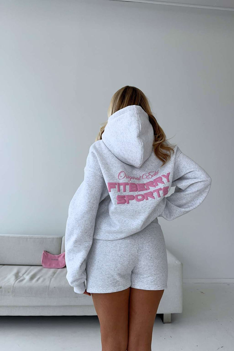 FITBERRY® ORIGINAL EDIT OVERSIZED HOODIE. An oversized hoodie crafted from premium high-quality cotton fabric. The hoodie has a soft fleece interior, dropped shoulders, a cozy hood and ribbed details on the sleeves and waist. Featuring Fitberry Original Edit print to front and back.