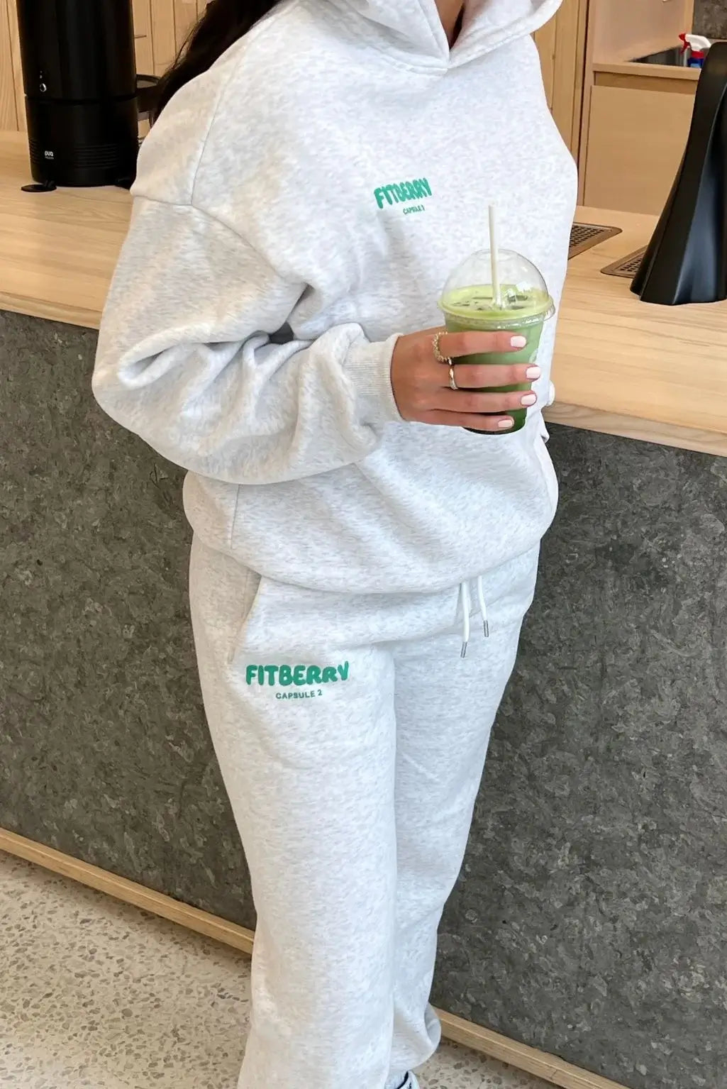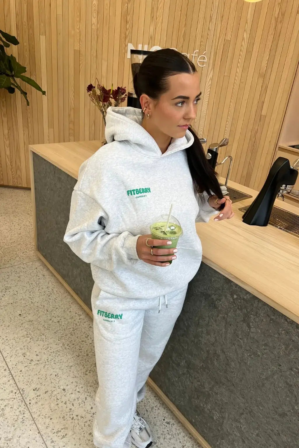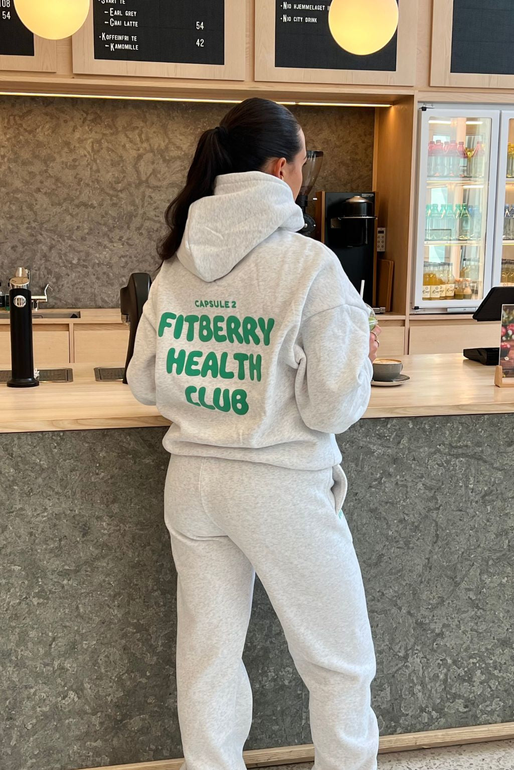 FITBERRY® HEALTH CLUB OVERSIZED HOODIE. An oversized hoodie crafted from a premium high-quality cotton fabric. The hoodie has a soft fleece interior, dropped shoulders, a cozy hood and ribbed details on the sleeves and waist. Featuring our signature Fitberry Health Club Capsule 2 logo to front and back.