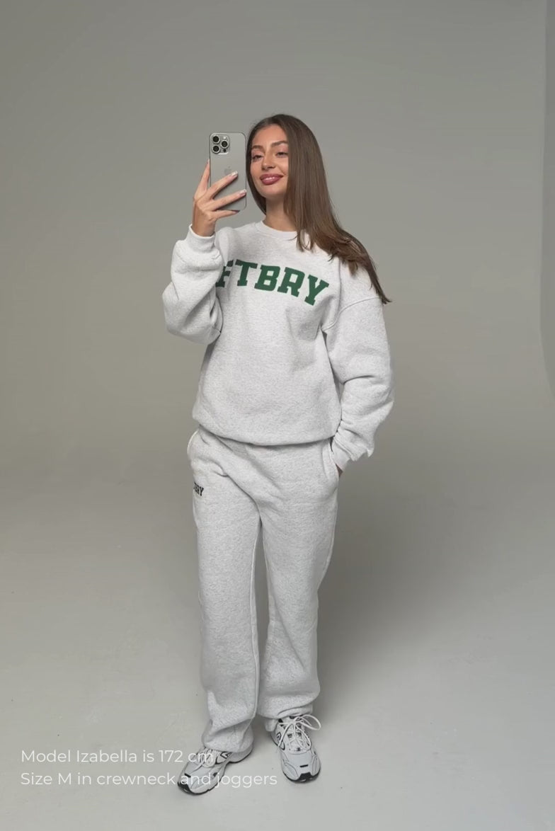 FITBERRY® SPORT & LEISURE OVERSIZED CREWNECK. An oversized crewneck crafted from premium high-quality cotton fabric. The crewneck has a soft fleece interior, round neck, dropped shoulders and ribbed details at the neck, cuffs and waist. Featuring FITBERRY® Sport & Leisure print to front.