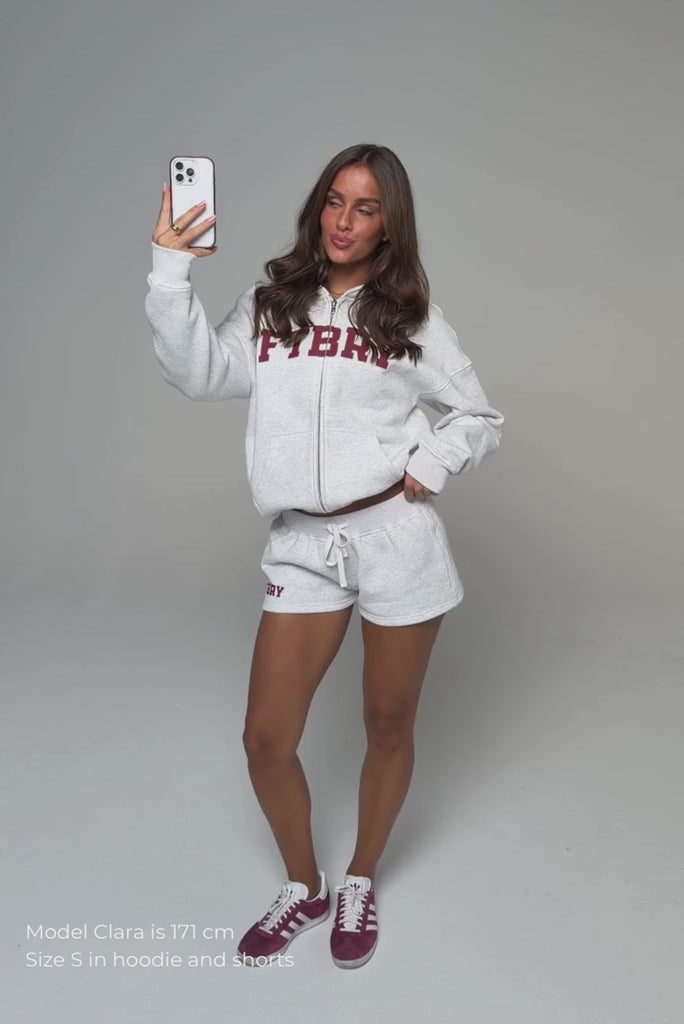 FITBERRY® SPORT & LEISURE SHORTS. Low-waist shorts with a flattering fit. Crafted from a premium high-quality cotton fabric. The shorts feature a soft fleece interior and an adjustable drawstring waist. Featuring FITBERRY® Sport & Leisure print to front.