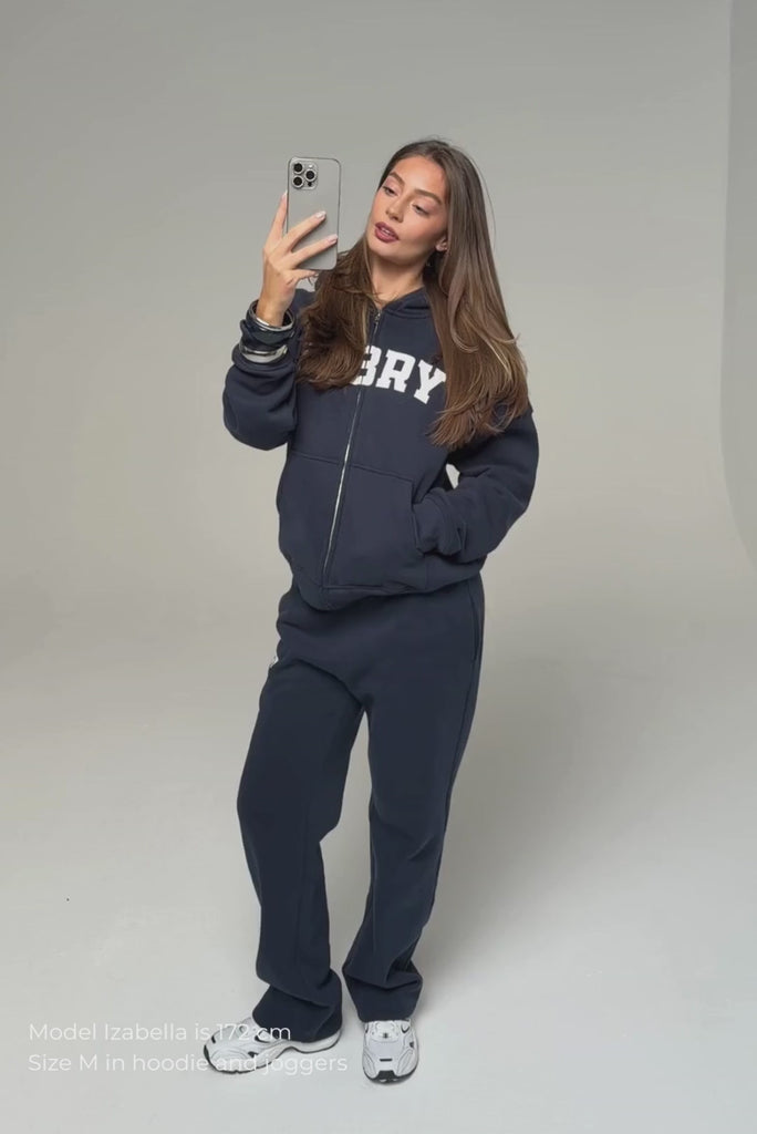 FITBERRY® SPORT & LEISURE STRAIGHT LEG JOGGERS. Mid-waist joggers with straight leg and the perfect fit. Crafted from a premium high-quality cotton fabric. The straight joggers have soft fleece interior, deep pockets and a hidden adjustable drawstring waist. Featuring FITBERRY® Sport & Leisure print to front.