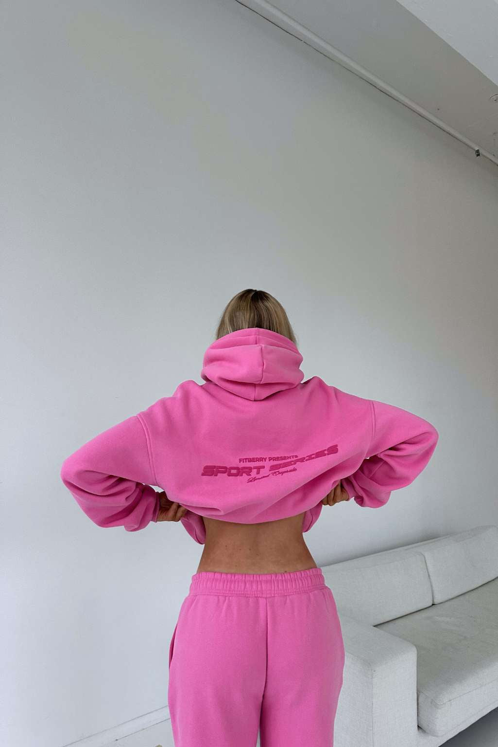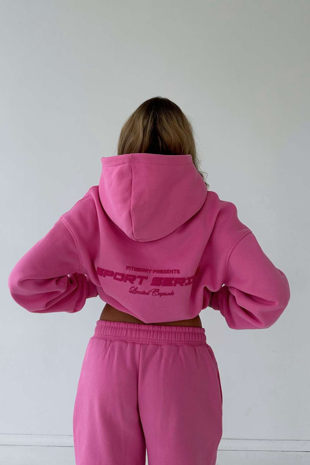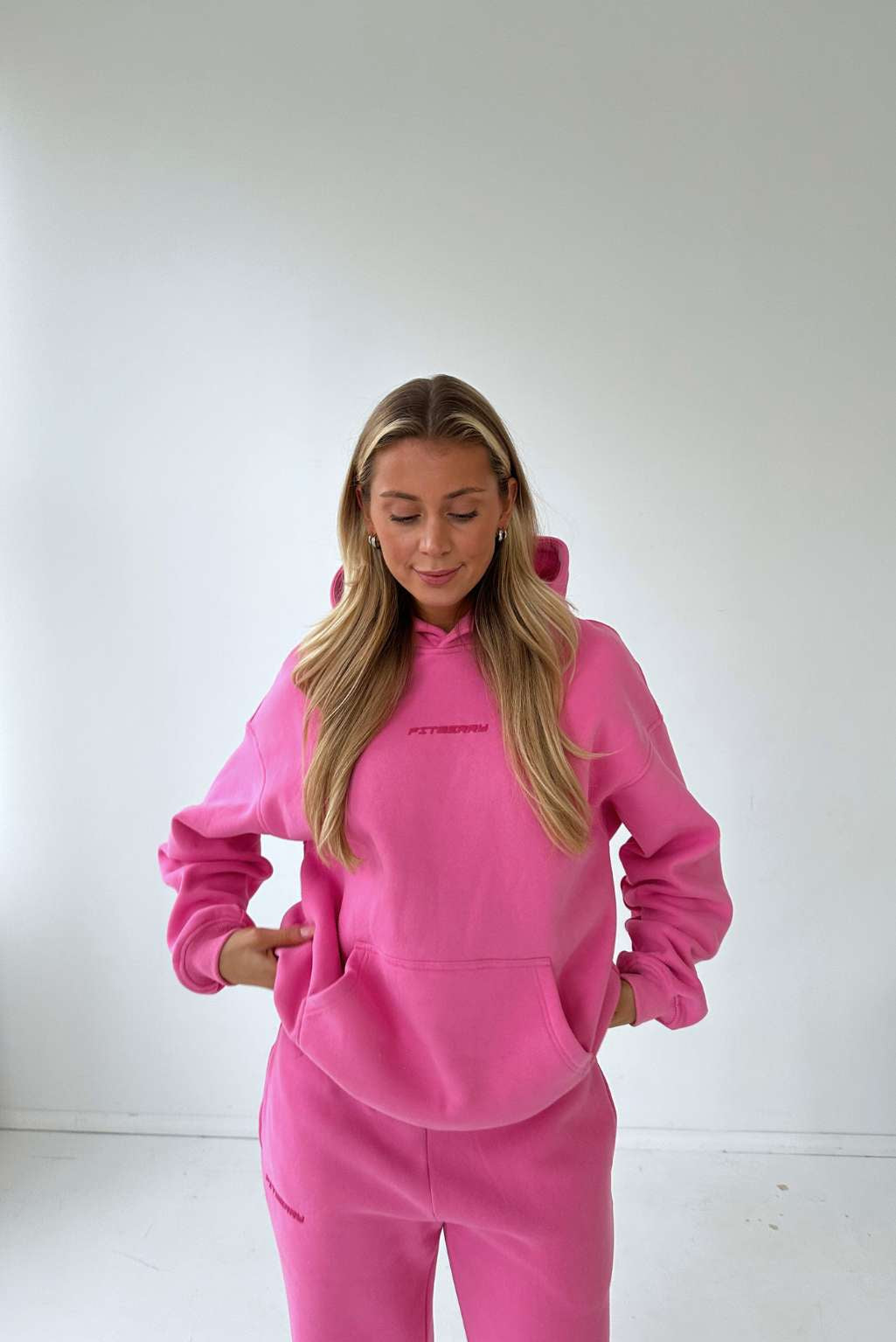 FITBERRY® SPORT SERIES OVERSIZED HOODIE. An oversized hoodie crafted from a premium high-quality cotton fabric. The hoodie has a soft fleece interior, dropped shoulders, a cozy hood, front pocket and ribbed details on the sleeves and waist. Featuring our Fitberry Sport Series print to front and back.
