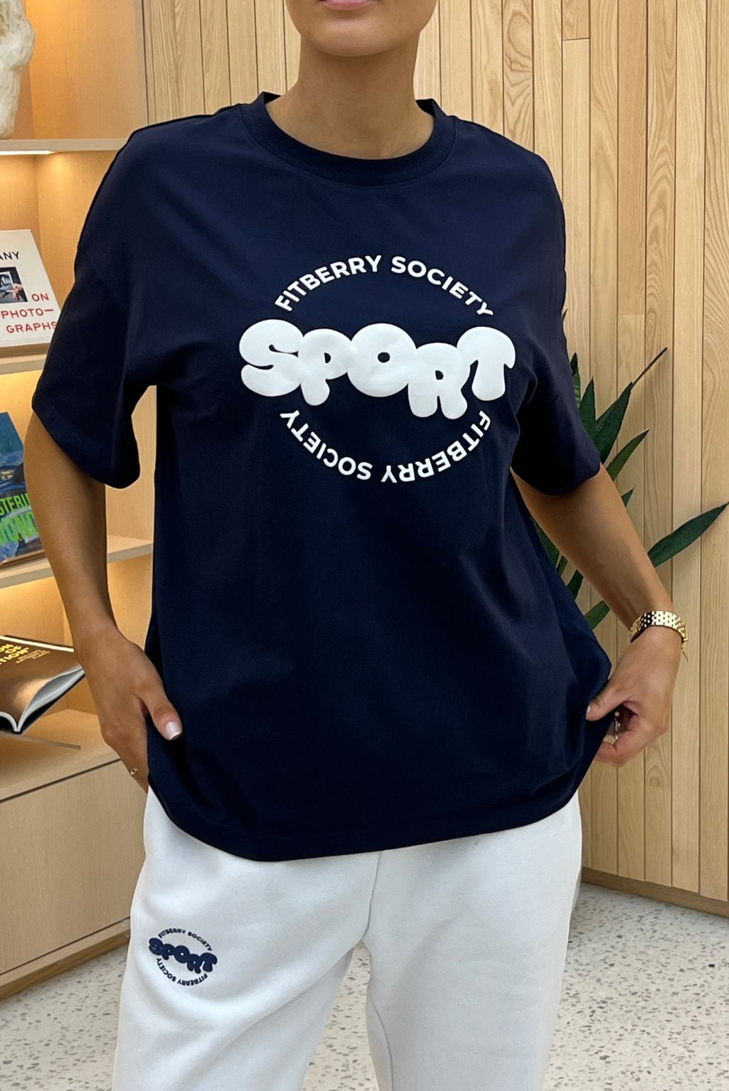 FITBERRY® SPORT SOCIETY OVERSIZED TEE. A t-shirt with an oversized fit. Crafted from a premium high-quality cotton fabric with a soft handfeel. The tee has a round neckline, dropped shoulders, loose sleeves and Fitberry logo to front.
