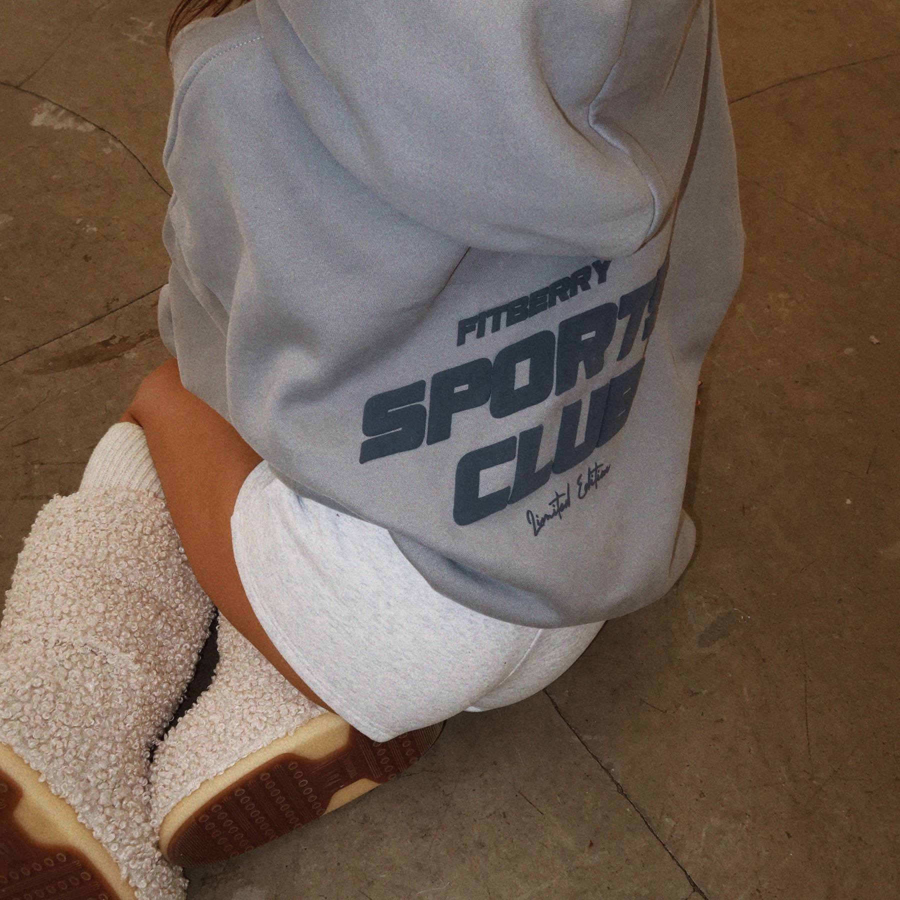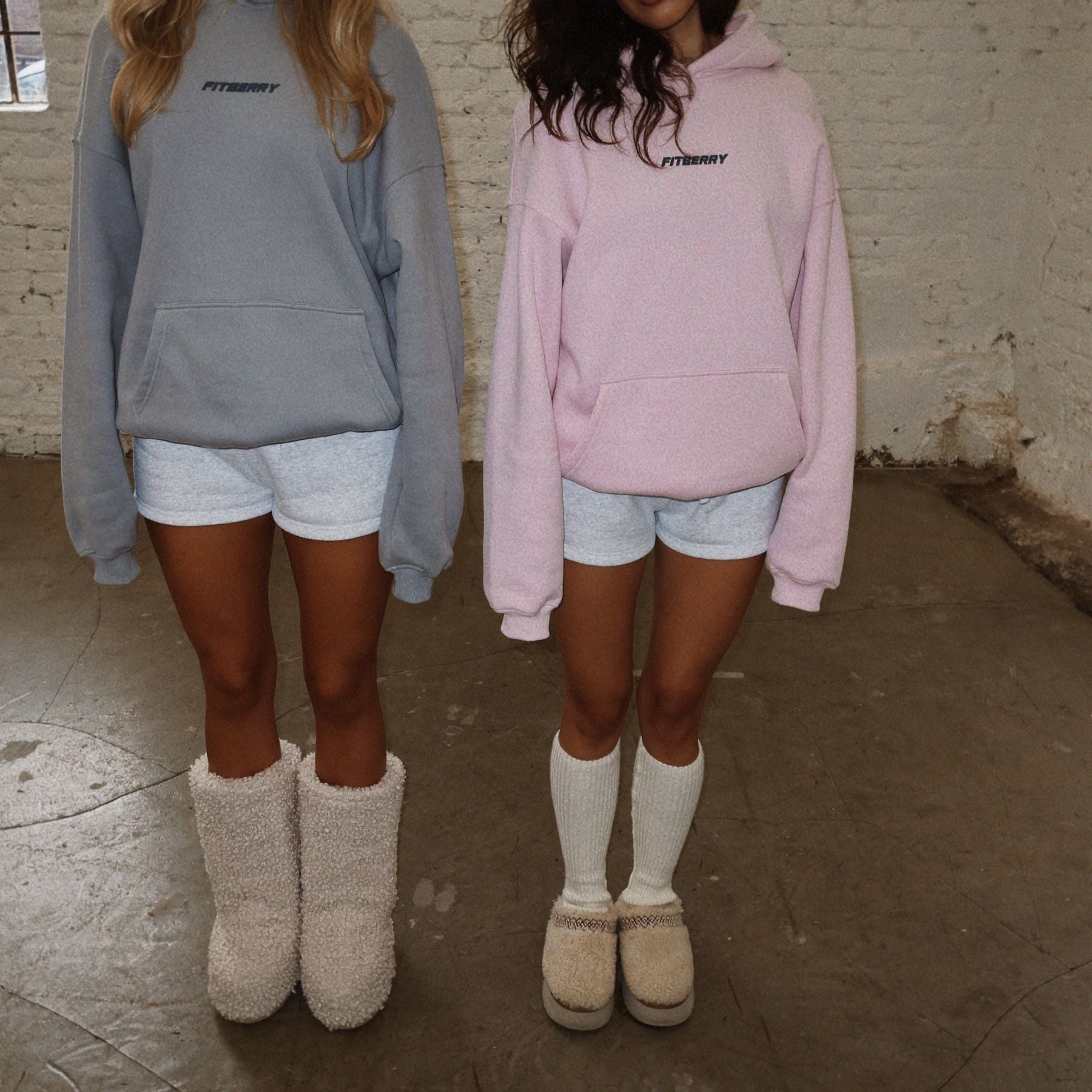 FITBERRY® SPORTS CLUB OVERSIZED HOODIE. An oversized hoodie crafted from premium high-quality cotton fabric. The hoodie has a soft fleece interior, dropped shoulders, a cozy hood, front pocket and ribbed details on the sleeves and waist. Featuring Fitberry Sports Club print to front and back.
