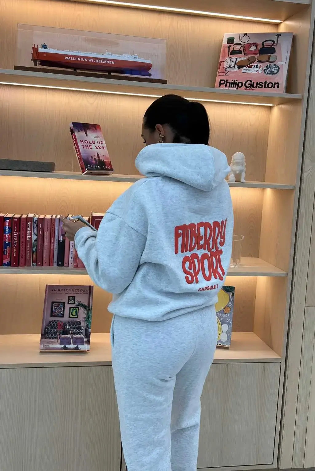FITBERRY® SPORTS CLUB OVERSIZED HOODIE. An oversized hoodie crafted from a premium high-quality cotton fabric. The hoodie has a soft fleece interior, dropped shoulders, a cozy hood and ribbed details on the sleeves and waist. Featuring our signature Fitberry Sports Club Capsule 3 logo to front and back.