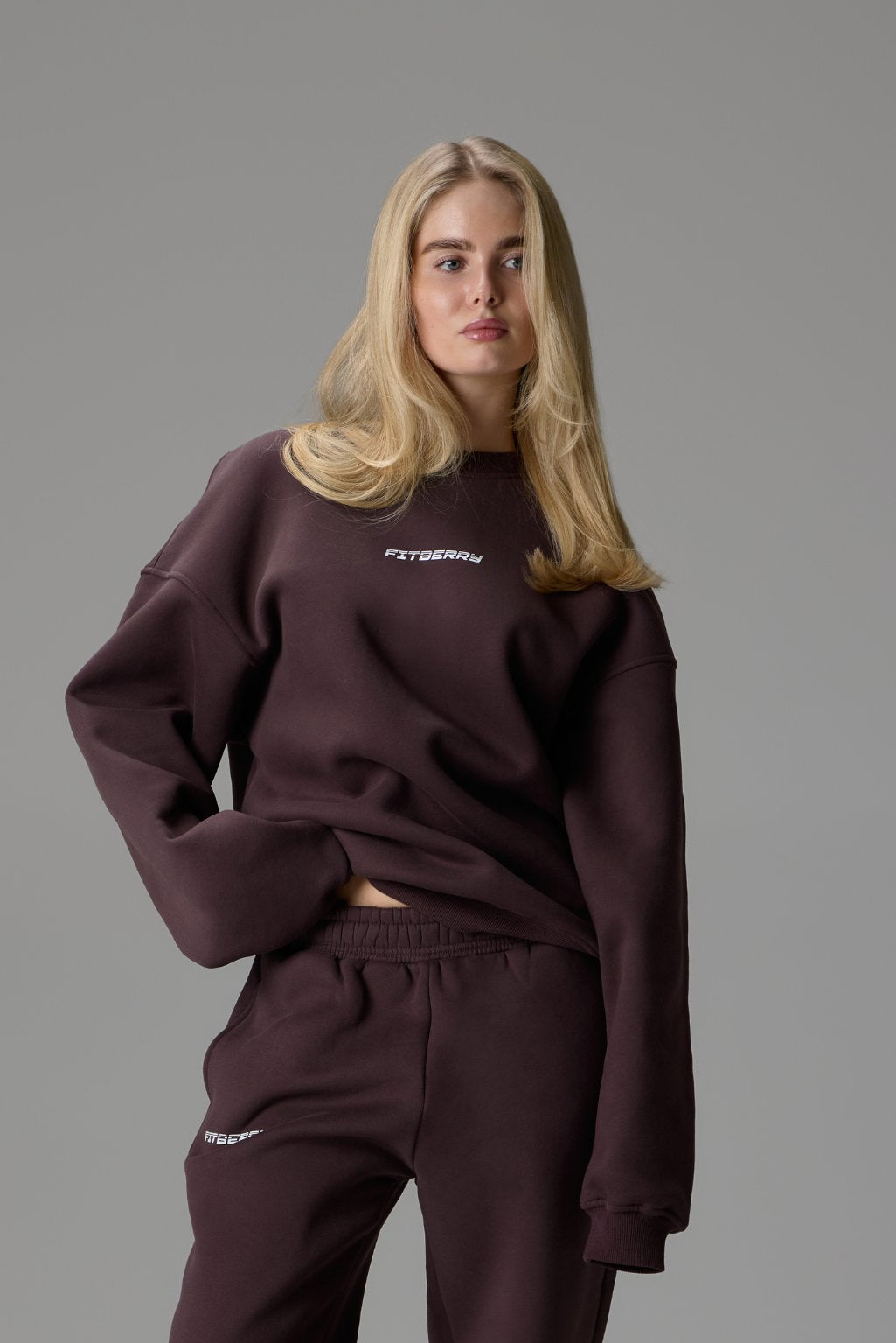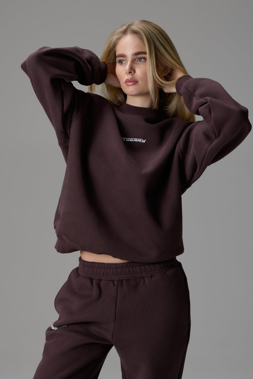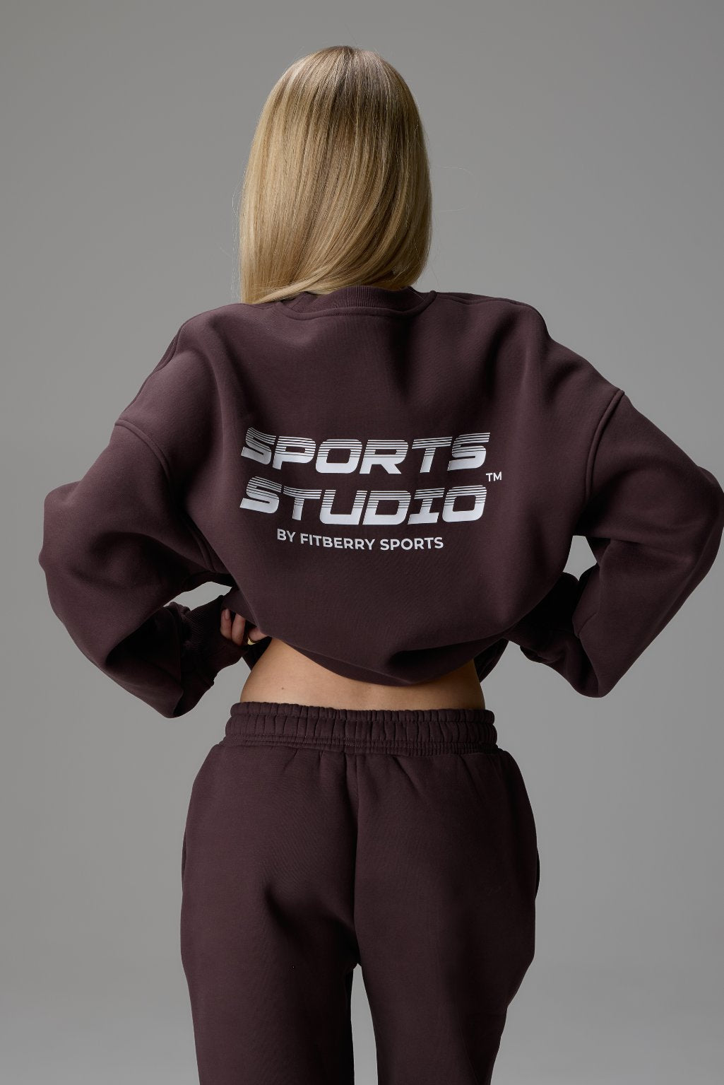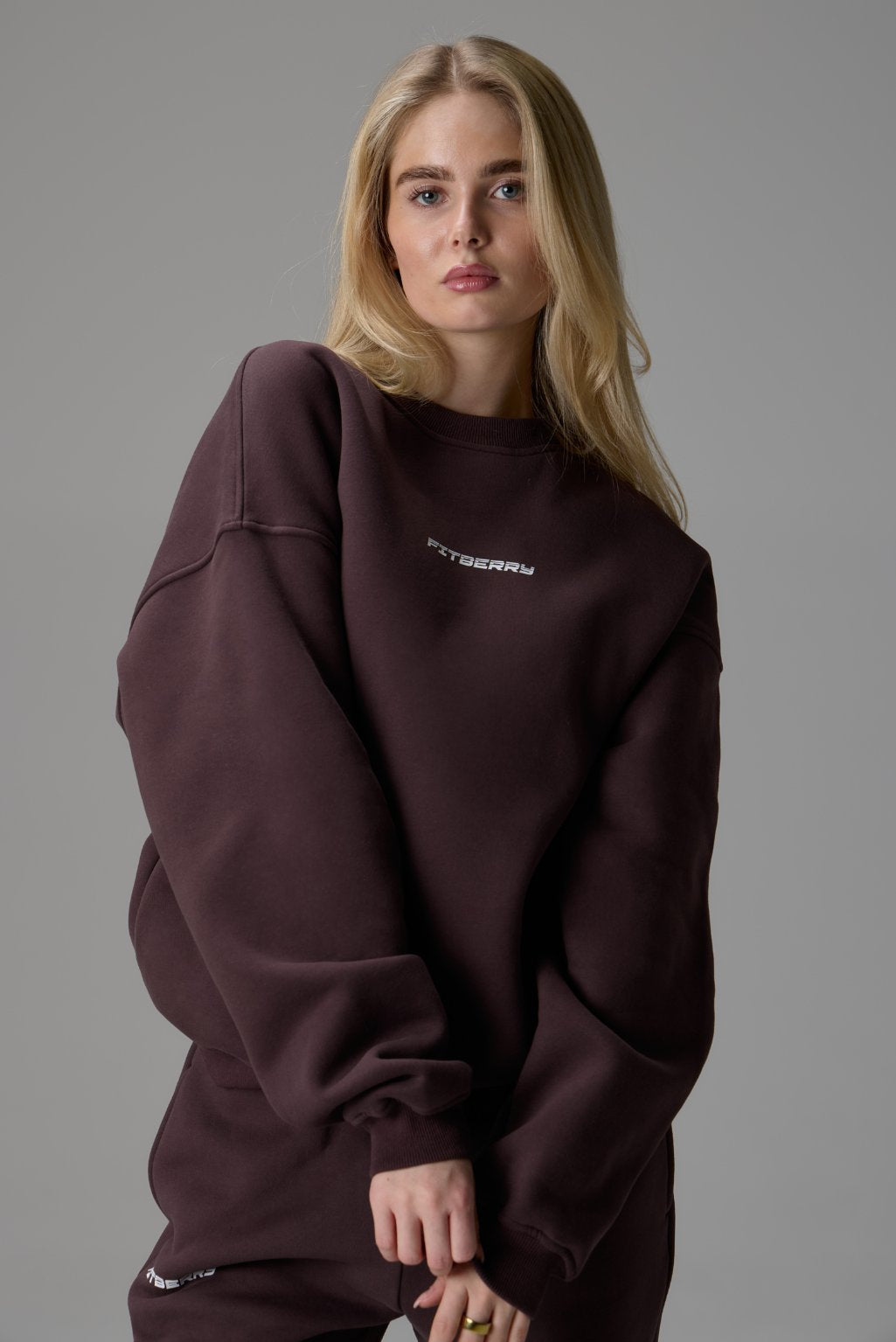FITBERRY® SPORTS STUDIO CREWNECK. An oversized crewneck crafted from premium high-quality cotton fabric. The crewneck has a soft fleece interior, round neck, dropped shoulders and ribbed details at the neck, cuffs and waist. Featuring FITBERRY® Sports Studio print to front and back.