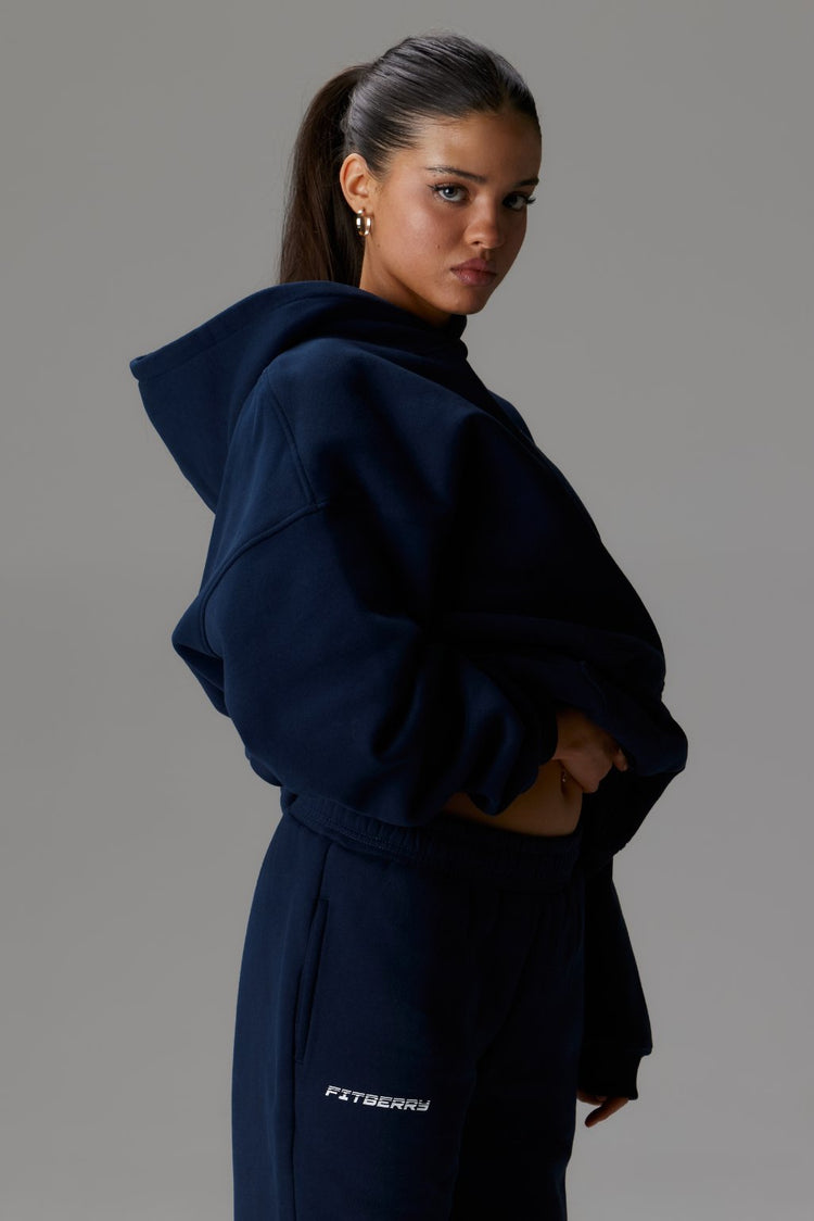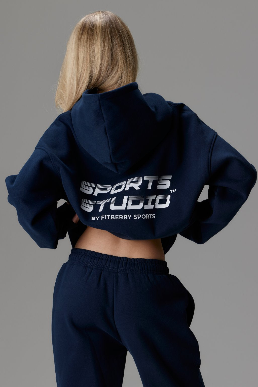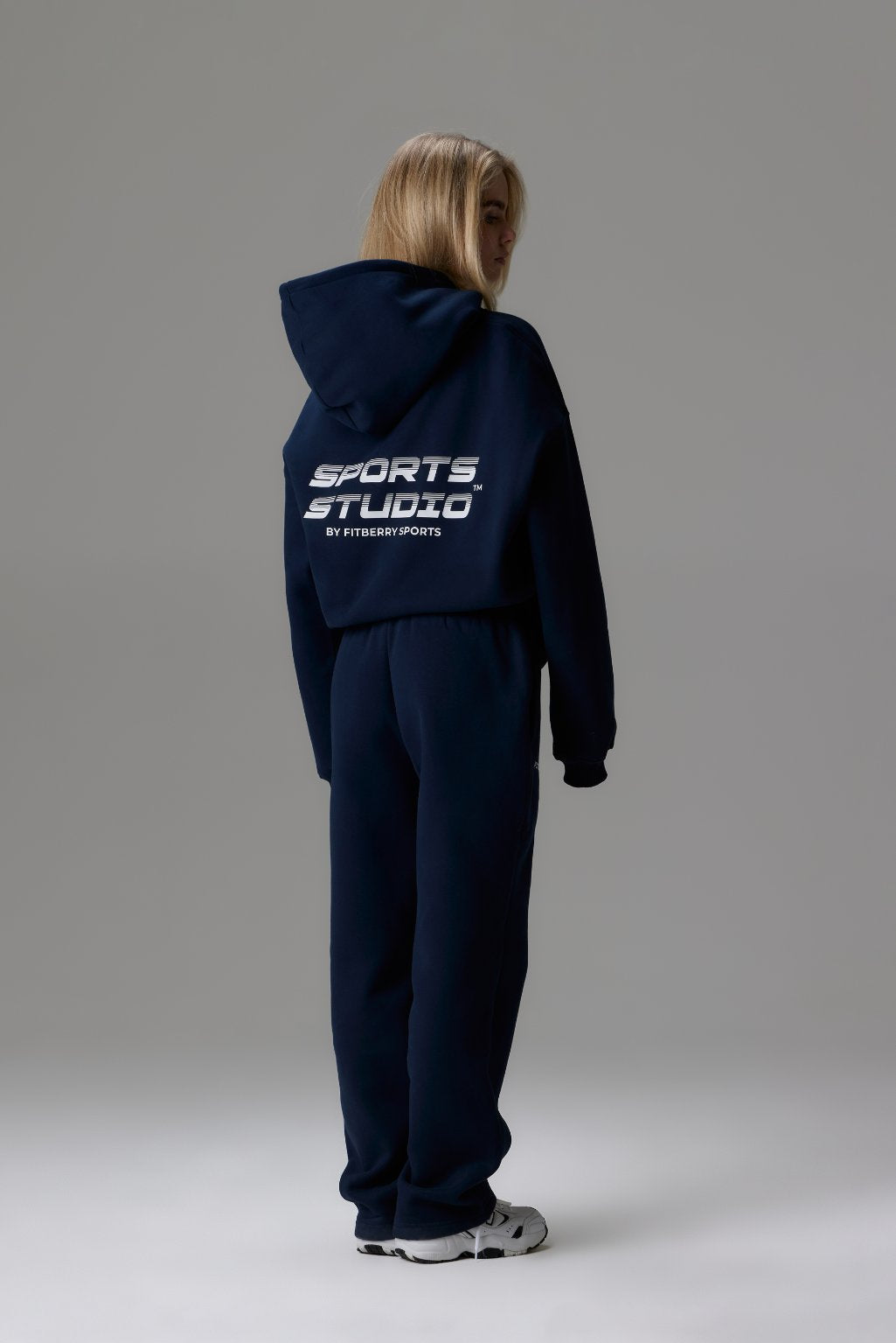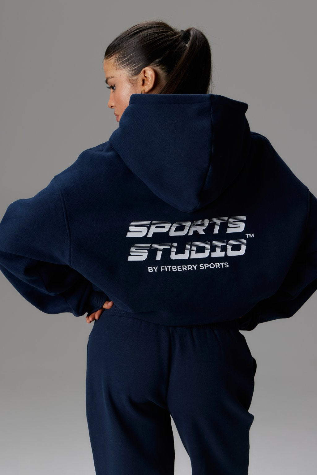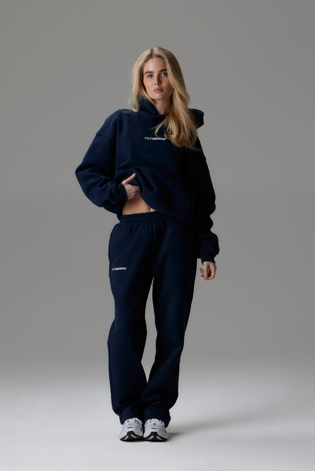 FITBERRY® SPORTS STUDIO OVERSIZED HOODIE. An oversized hoodie crafted from premium high-quality cotton fabric. The hoodie has a soft fleece interior, dropped shoulders, a cozy hood, front pocket and ribbed details on the sleeves and waist. Featuring our signature Fitberry Sports Studio print to front and back.