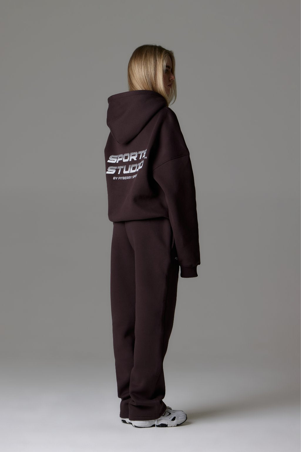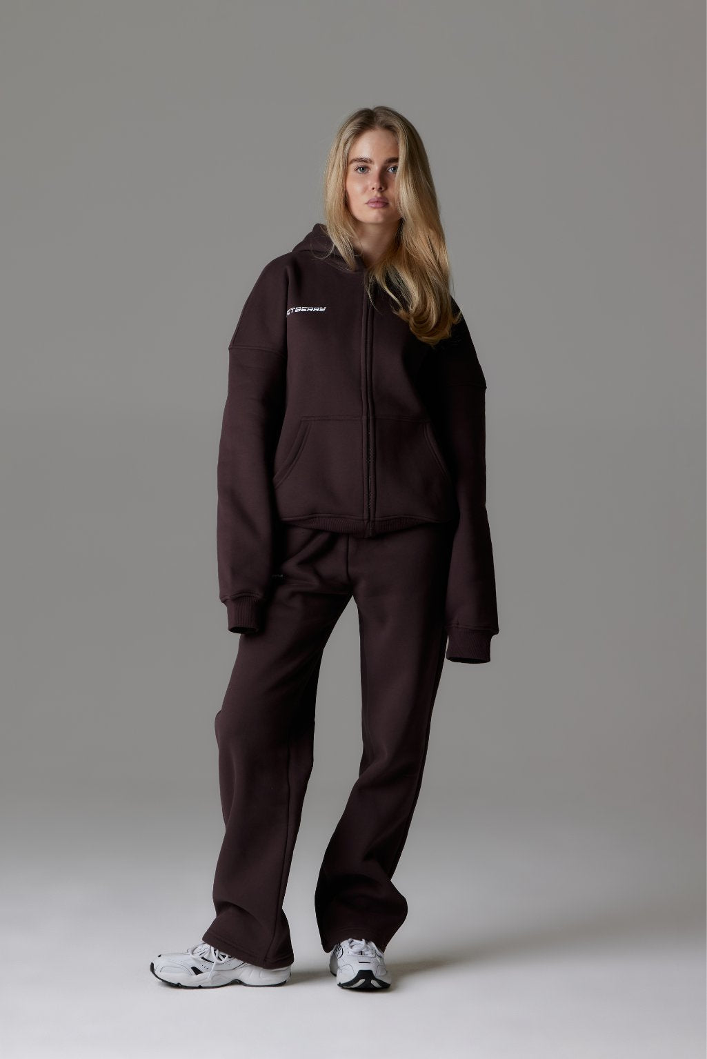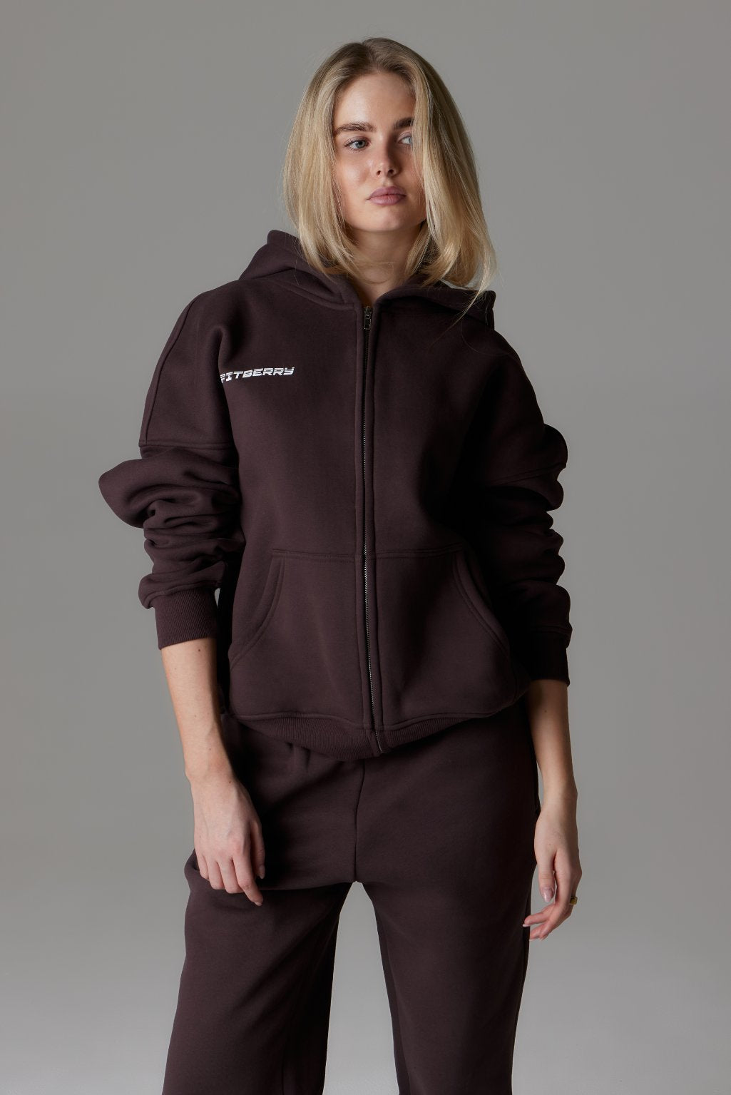 FITBERRY® SPORTS STUDIO ZIP HOODIE. A slightly oversized hoodie crafted from a premium high-quality cotton fabric. The hoodie has zipper in front, soft fleece interior, dropped shoulders, side pockets, a cozy hood and ribbed details on the sleeves and waist. Featuring Sports Studio print to front and back.