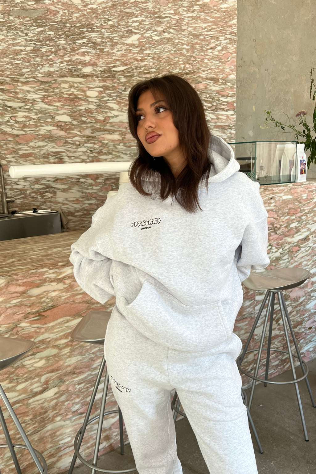 FITBERRY® SPORTY OVERSIZED HOODIE. An oversized hoodie crafted from premium high-quality cotton fabric. The hoodie has a soft fleece interior, dropped shoulders, a cozy hood, front pocket and ribbed details on the sleeves and waist. Featuring Fitberry Sporty print to front and back.