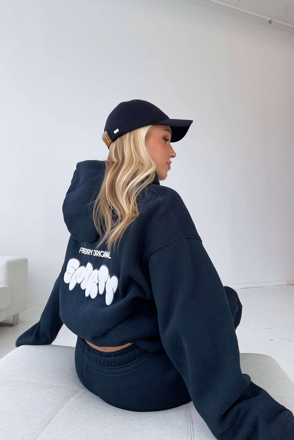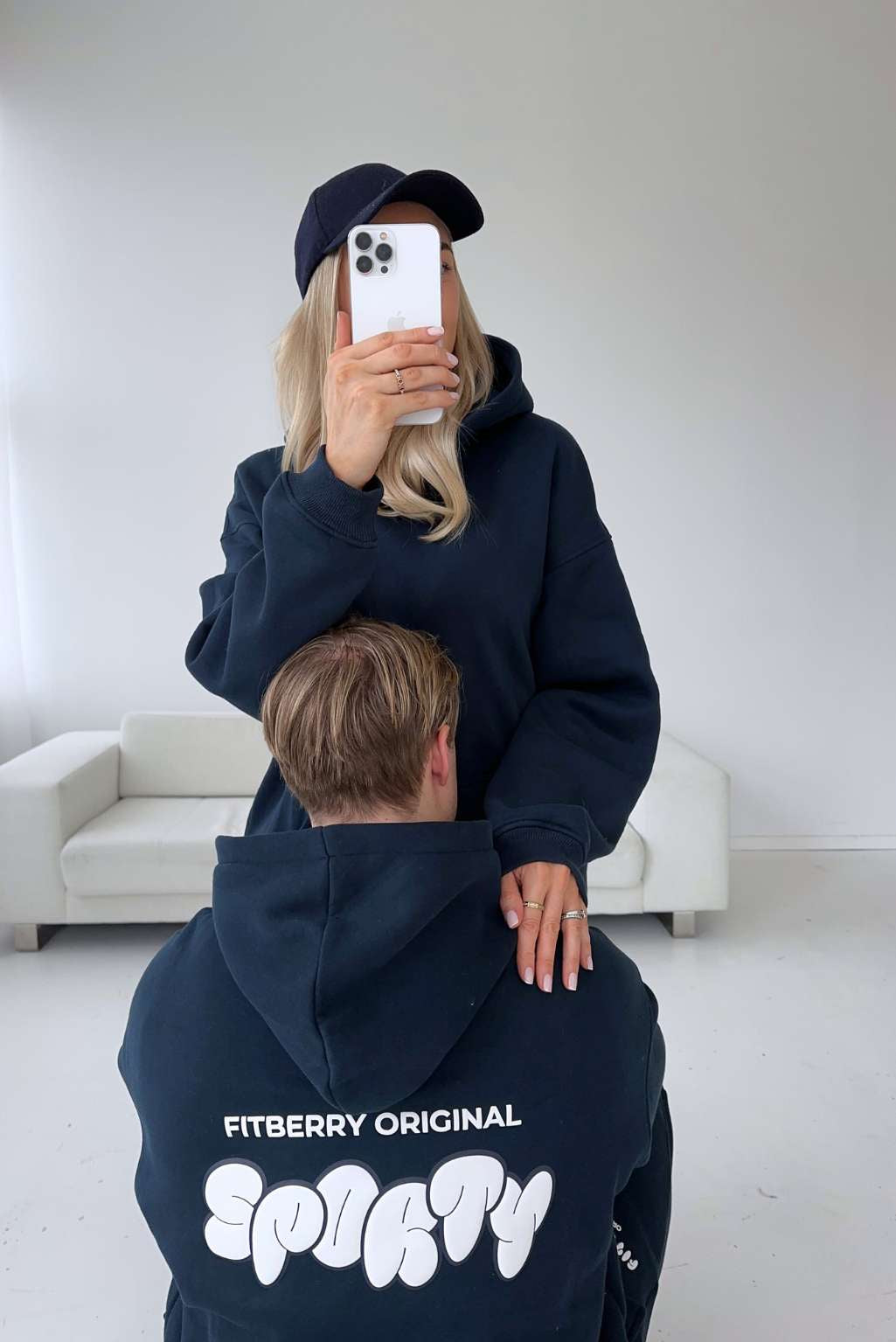 FITBERRY® SPORTY OVERSIZED HOODIE. An oversized hoodie crafted from premium high-quality cotton fabric. The hoodie has a soft fleece interior, dropped shoulders, a cozy hood, front pocket and ribbed details on the sleeves and waist. Featuring Fitberry Sporty print to front and back.